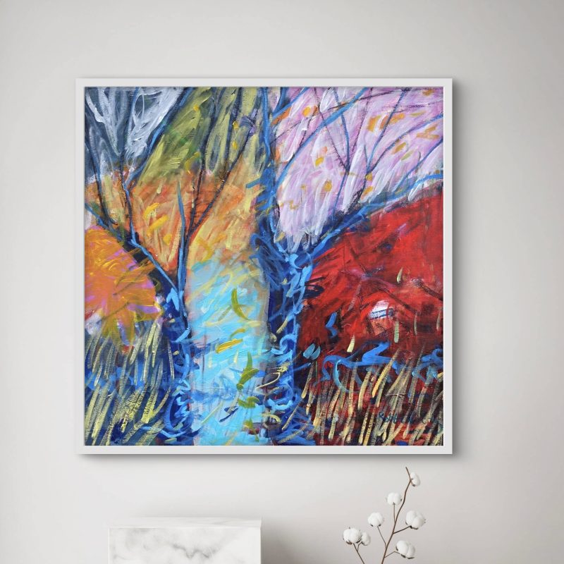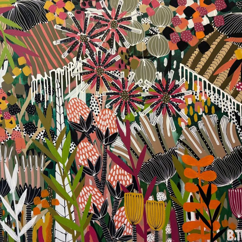 This artwork is an abstract original using the contrasting textures of acrylic paint, oil stick and artist markers. My inspiration comes from living on the doorstep to the Blue Mountains NSW and being surrounded by enchanting forests filled with natures best. ‘Heart and Harmony’ is part of my gum leaves and blossoms study, where I aim combine elements of natural beauty with a touch of whimsy and capturing not just the visual beauty, but the feeling of being immersed- surrounded by layered textures, subtle movements and patterns that highlight the organic and raw beauty of gum trees filled with trailing leaves and native blossoms. My aim was to use a bold gum tree green background that was to create a vibrant contrast against the rich red blossoms, pink and blush tones. This mini botanical magic is an authentic creation and was made with love, thankyou for visiting x