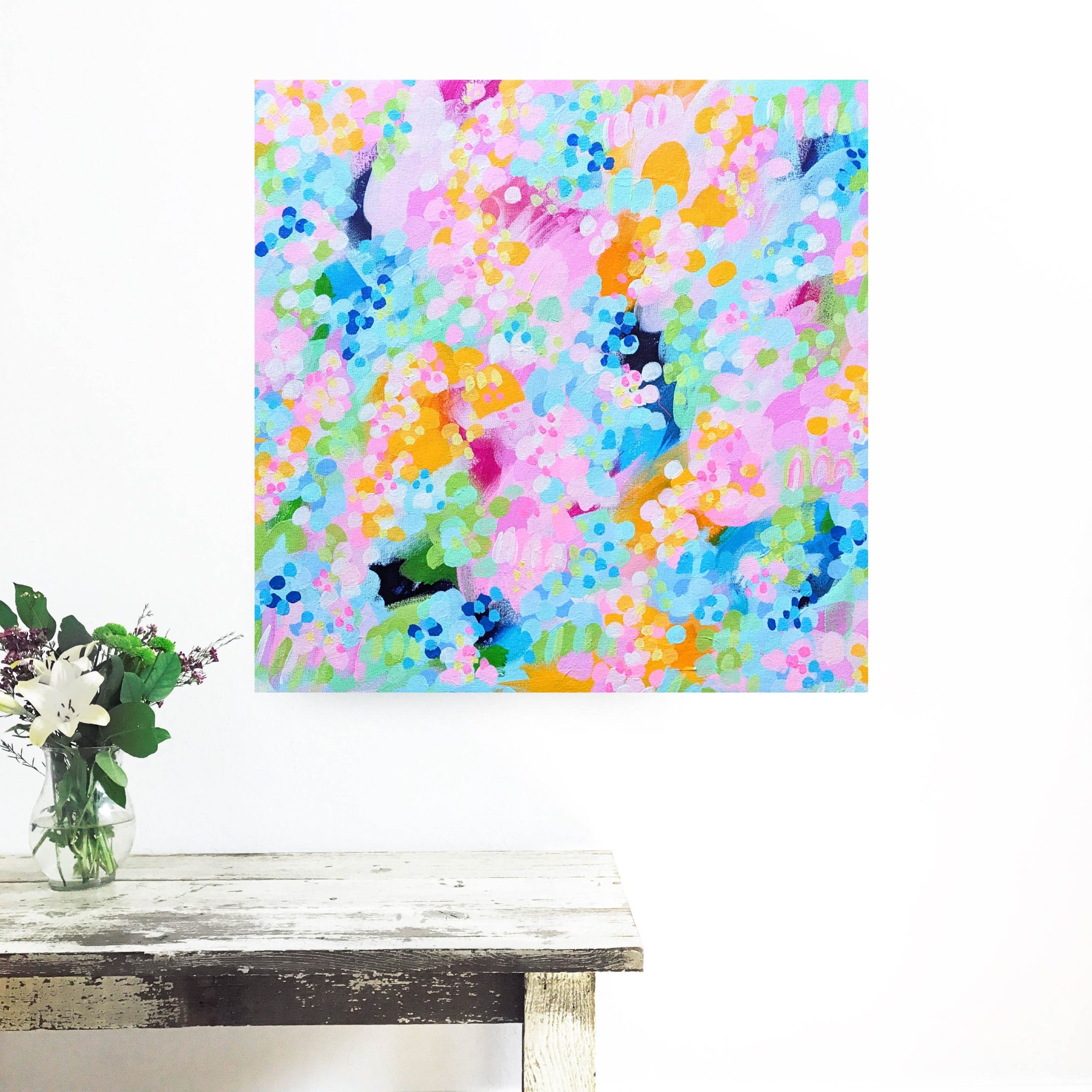 I am feeling so much joy creating these artworks and exploring this style that came about while experimenting with some different mediums and brushes in the studio this week. I am drawn to these colours as they uplift my soul and make me happy in a time where I feel we can all do with some happiness and colour in our lives. Joyous and free with a whole lot of energy which I hope you can feel when looking at these artworks.