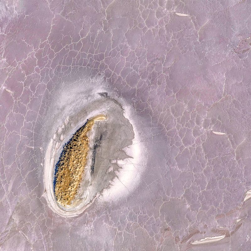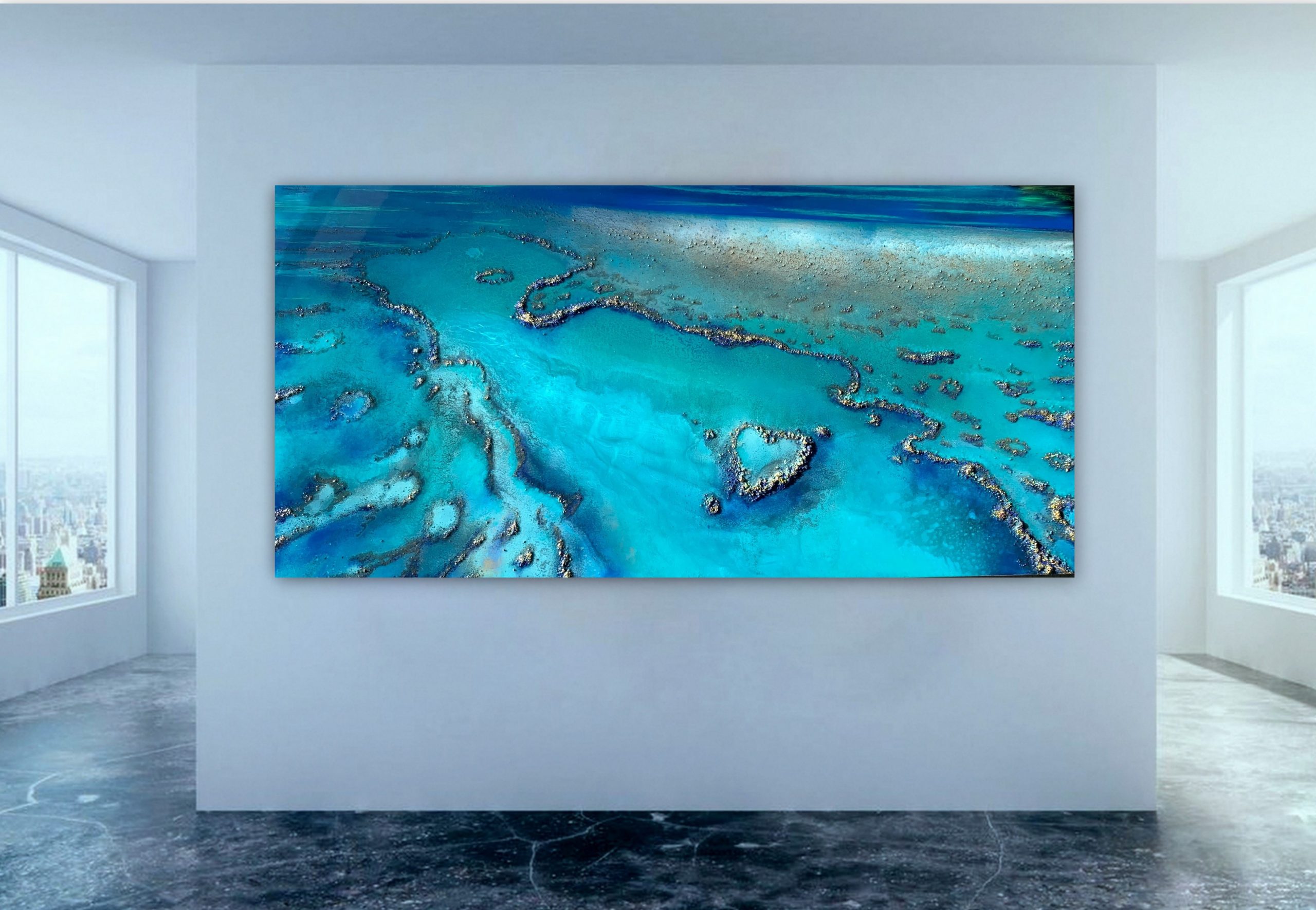 Heart Reef by Petra Meikle de Vlas –  is a highly textured, 3 dimensional,  aerial view of the Heart Reef, in the Whitsundays, on the Great Barrier Reef.