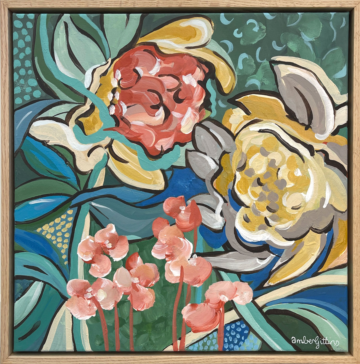 Heart to Heart is a bold, emotive floral painting that speaks to connection, conversation, and quiet understanding. Rich teal and deep green tones form a lush, layered backdrop for expressive blooms in warm coral and buttery yellow – each outlined with confident, rhythmic lines that give the piece a lively, contemporary energy.