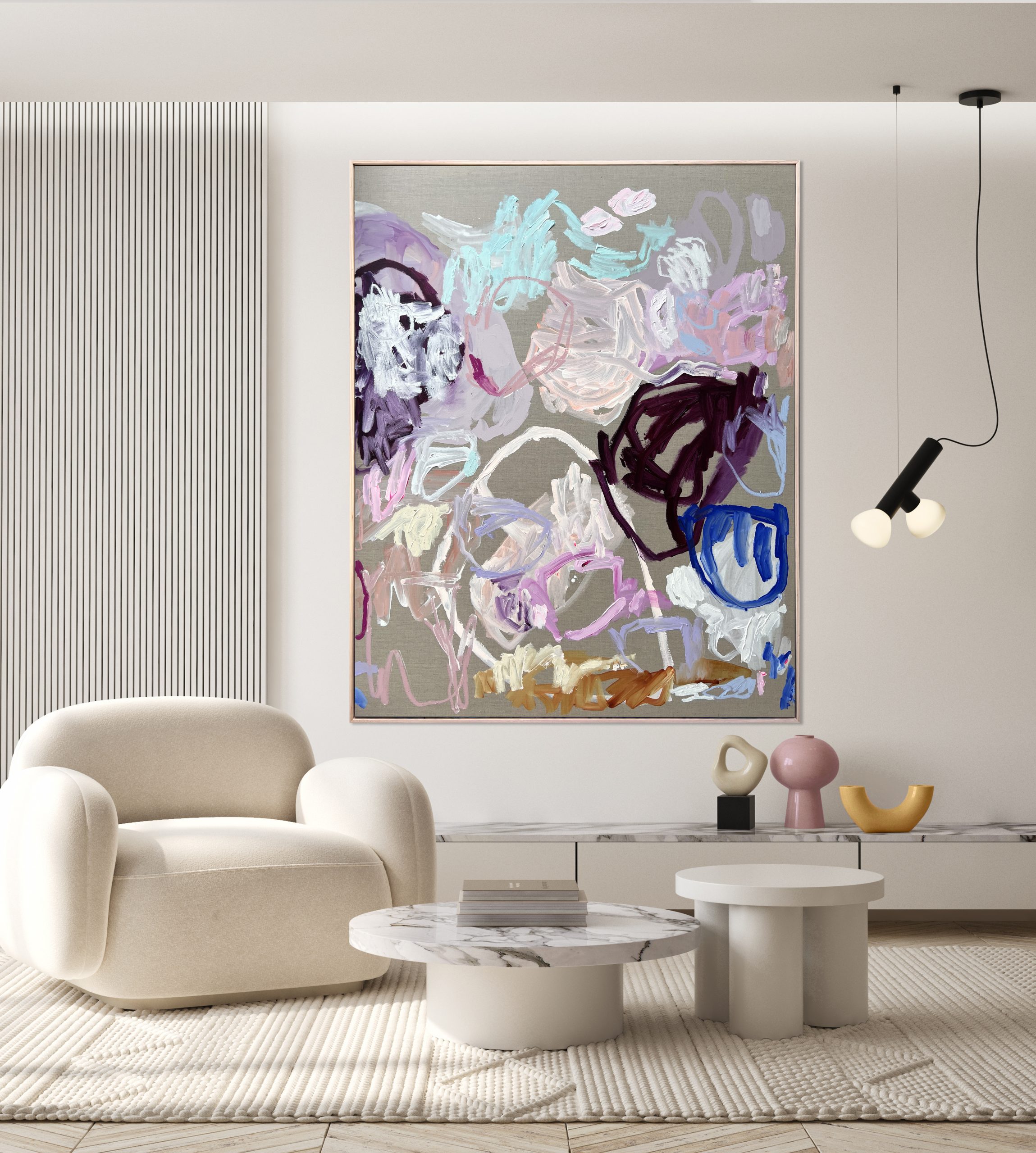 She may be pastel – but she has attitude! Bold and vibrant, ‘Heartbreaker’ is an abstract painting that’s full of life and energy. Painted on raw natural linen, this piece uses its textured background to make the colours and dynamic shapes stand out. A piece you could stare at forever. The piece is designed to elicit a response from the viewer, evoking joy, serenity, and energy – whatever emotion they need.