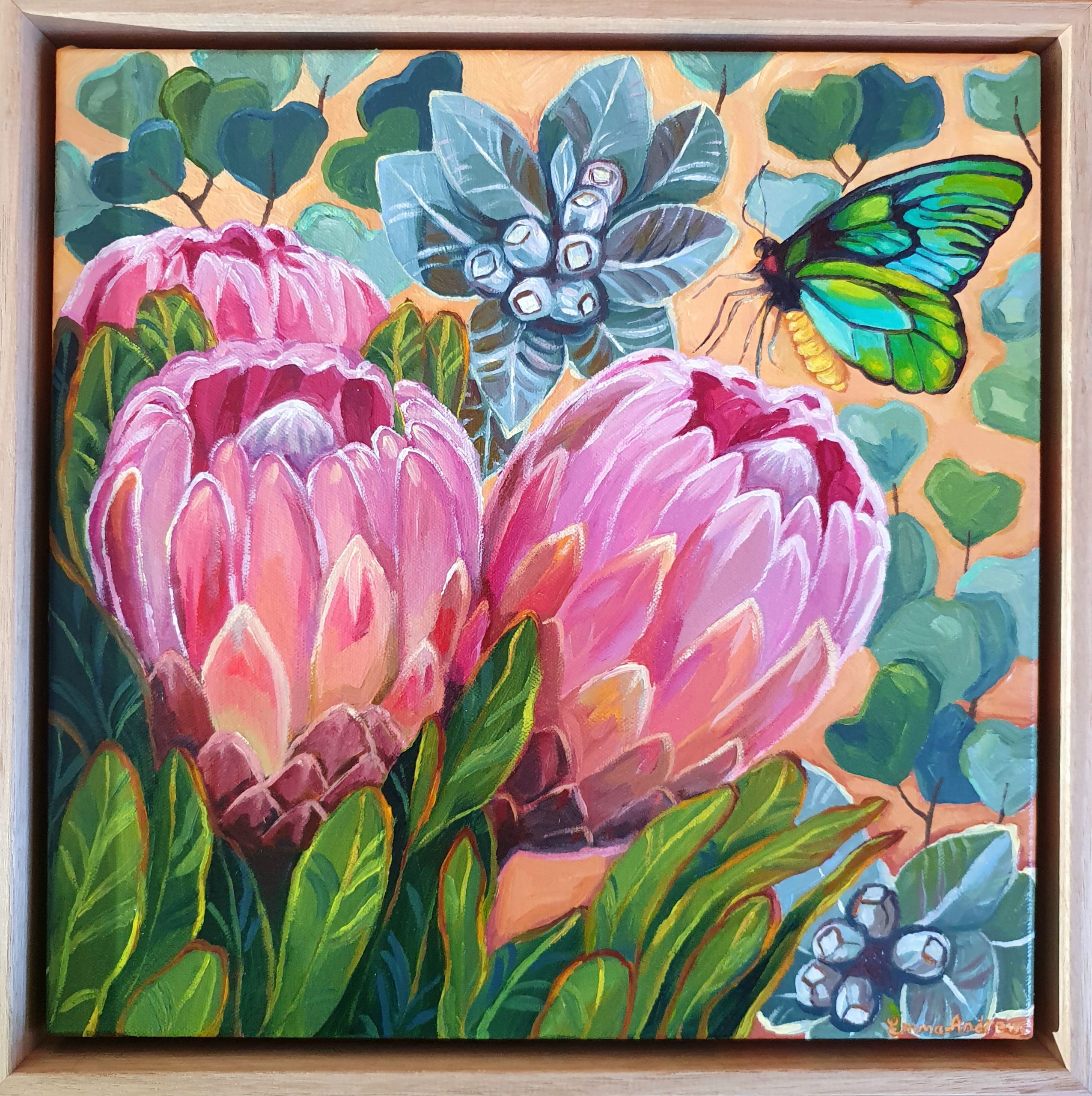 Heartfelt by Emma Andrews – Original acrylic painting featuring pink Protea flowers, heart shaped eucalyptus leaves and Bird Wing Butterfly.
