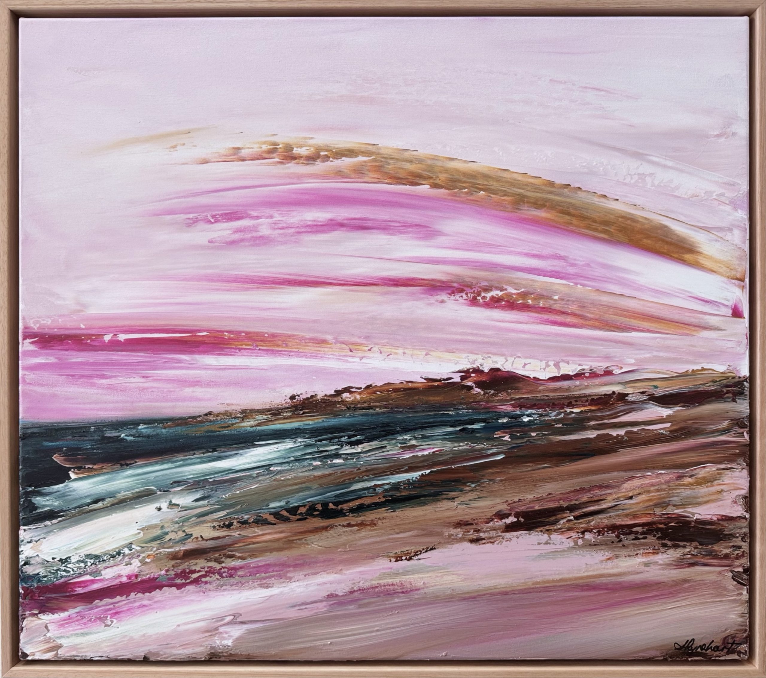 Created on high quality 12 oz stretched polycotton, this beautifully bold palette knife artwork is framed in a gorgeous Flooded Gum solid timber frame, and satin varnished to preserve the archival integrity of the colours for years to come.
