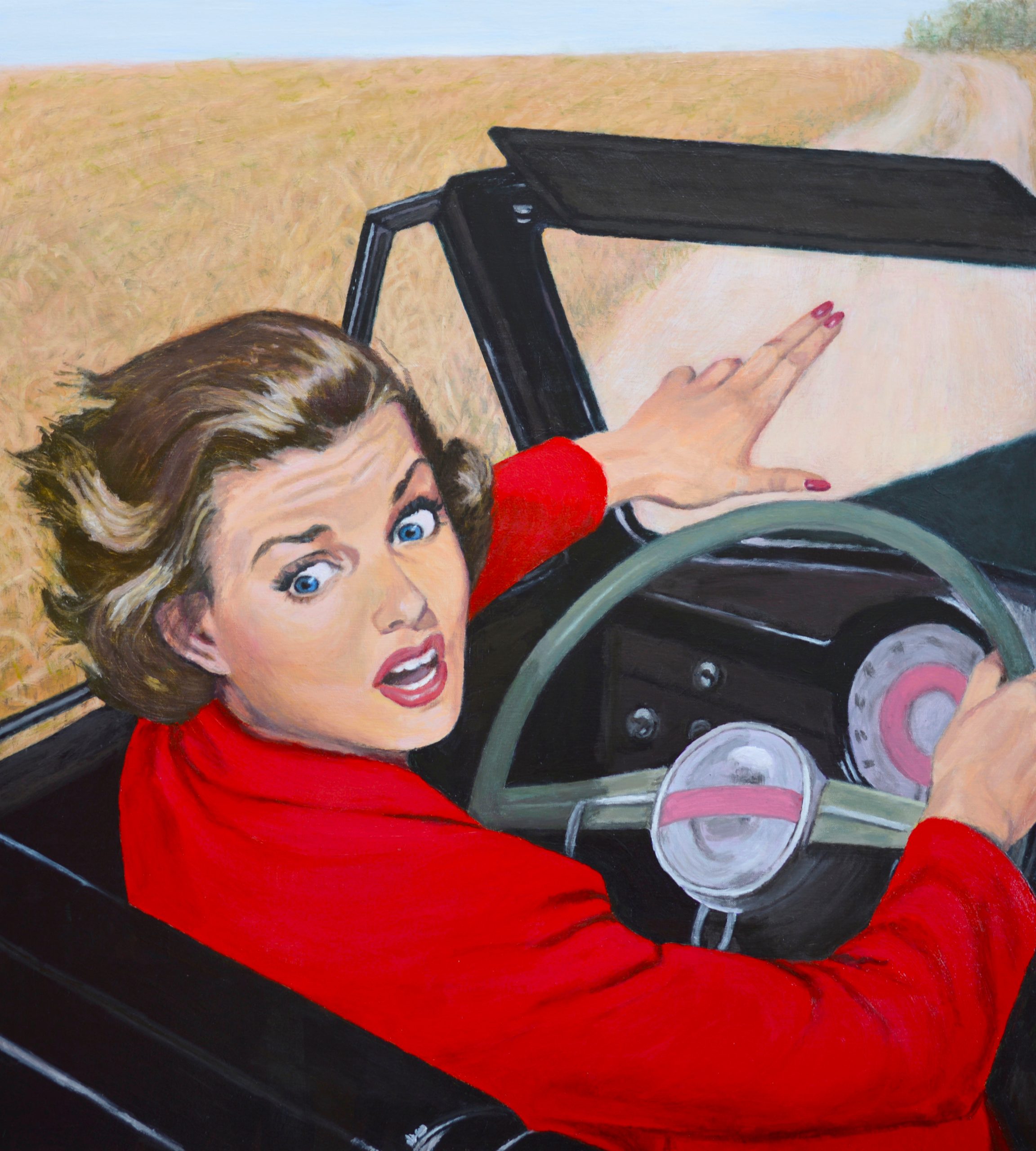 Jane’s painting is inspired by the pulp detective magazines that were popular from 1930s to the 1950s – she has appropriated a 1950s cover of a scared woman in a convertible sports car and placed her in a wheat field in the USA heartland.