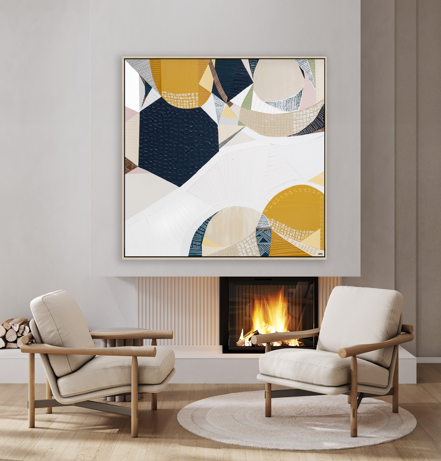 Painting size 104cm x 104cm framing options in Tasmanian Oak, black, or white.