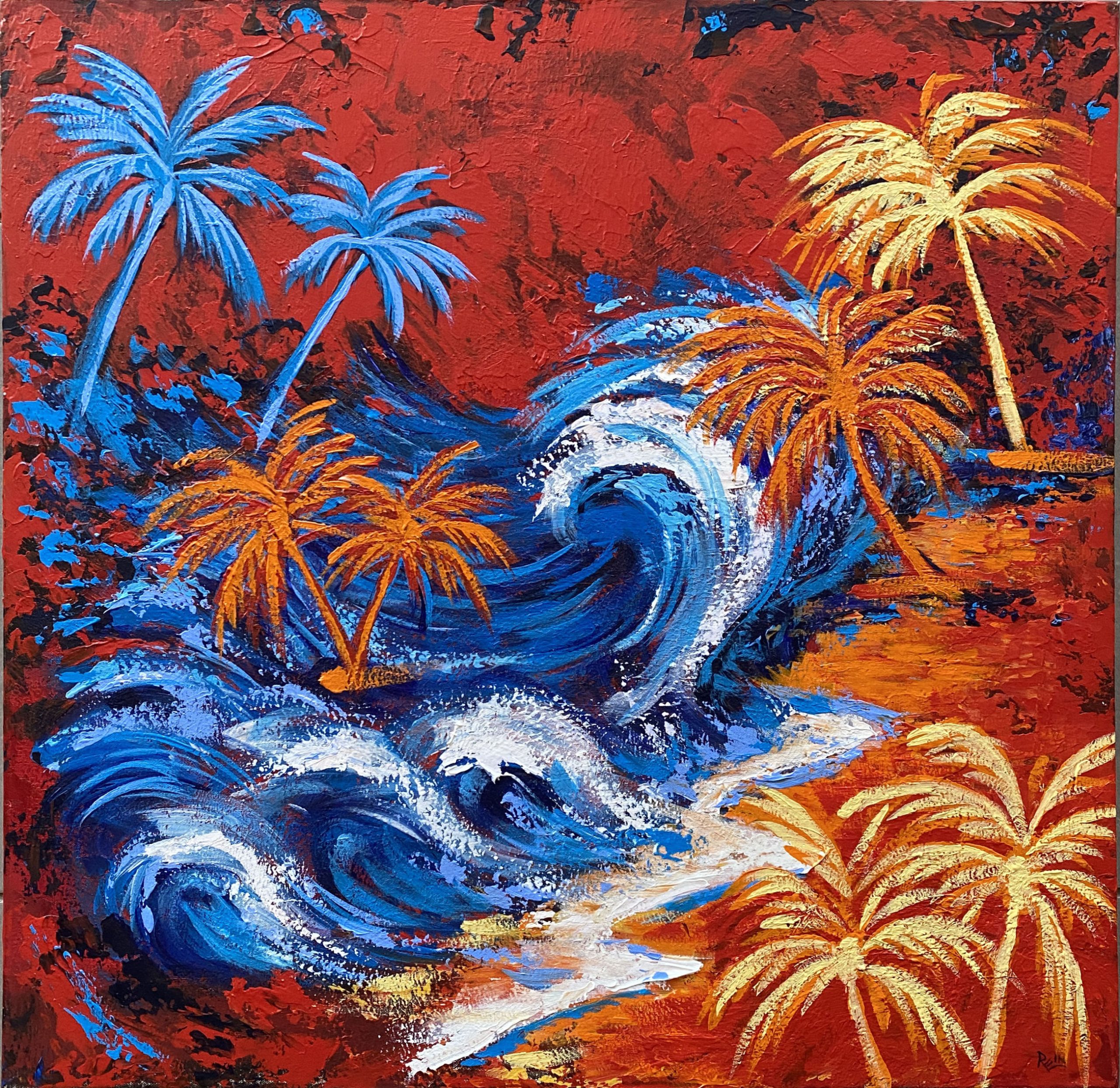 This original acrylic painting brings tropical chaos to life, with powerful, swirling blue waves crashing against a fiery landscape. Colourful palm trees sway against the heat-soaked backdrop, capturing the energy of a coastline in upheaval.
