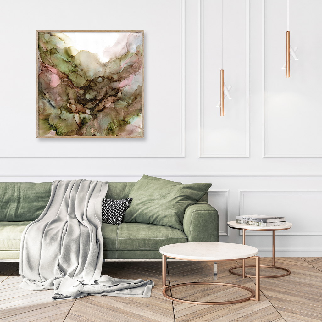 A framed original artwork created with a calming and soft arrangement of colour across the page reminiscent of mountains. The artwork features beautiful brassy gold highlighting throughout.