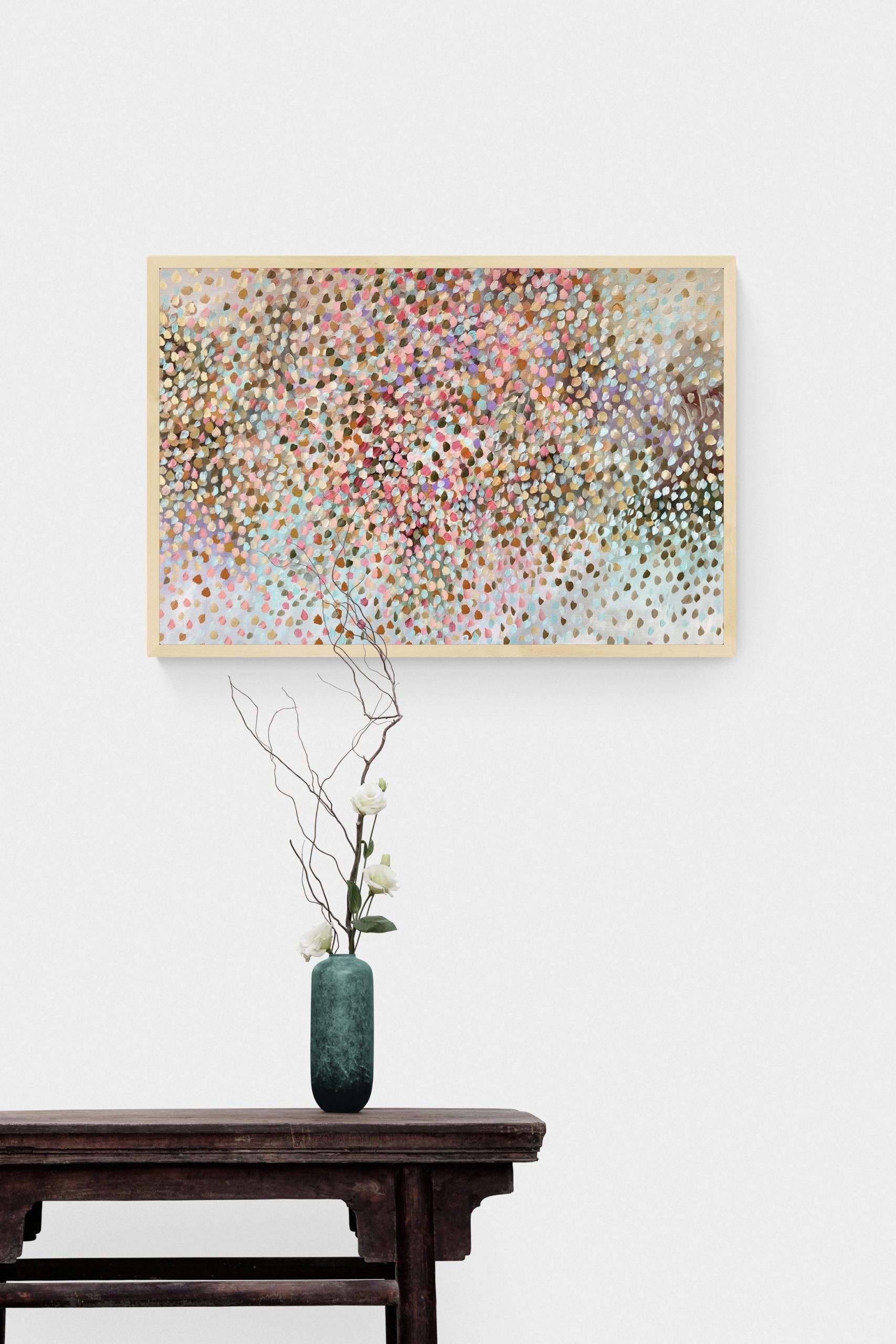 Heavenly Blessings by Theo Papathomas a painting with lots of layers of light colours of petals covering the hills. This is a place you can let your self go and dream. The landscape becomes a bouquet of petals dancing over the land. I tried to create this beautiful composition of colours of the landscape . Capturing the beautiful colours of the petals, foliage of the trees like musical notes dancing over the landscape . The Forest comes to life with lots of rhythms and sounds of the petals. A very peaceful and tranquil painting. The painting does not come come with an external frame.The painting is signed and dated 2021 at the back and comes with a certificate of Authenticity.