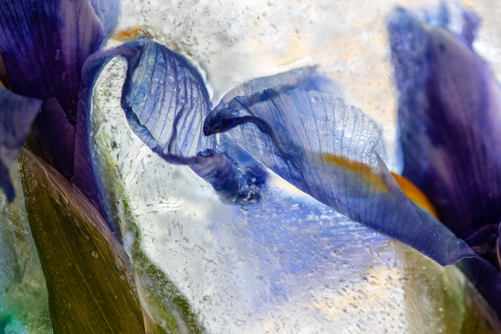 Held together – Iris – Below Zero by Melissa Jane –Â This series is a new version of an old favorite inwhich encapsulates the delicate Stem and Petals of the Iris flower frozen in time. Tiny bubbles are seen escaping forming patterns throughout the entombed iced water. A creation of love and a favorite by the artist.