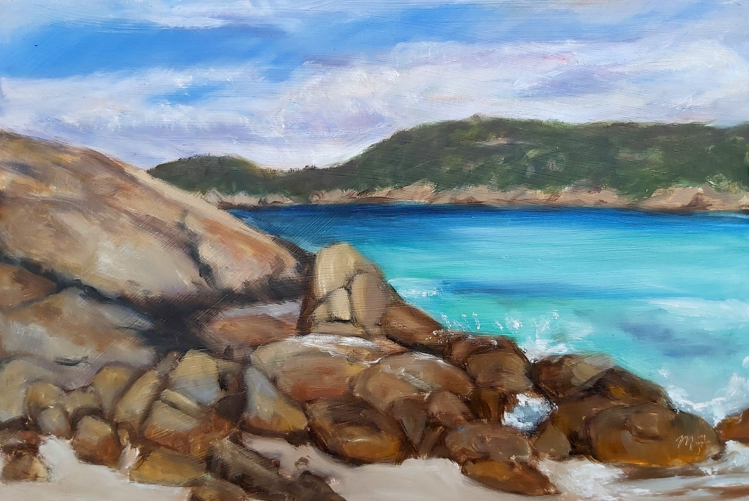 Hellfire Bay is a lovely beach on the south coast of WA near Esperance. Painted en plein air whilst holidaying at Lucky Bay, (famous for its blue waters and kangaroos on the beach) and completed with a dark wooden frame.