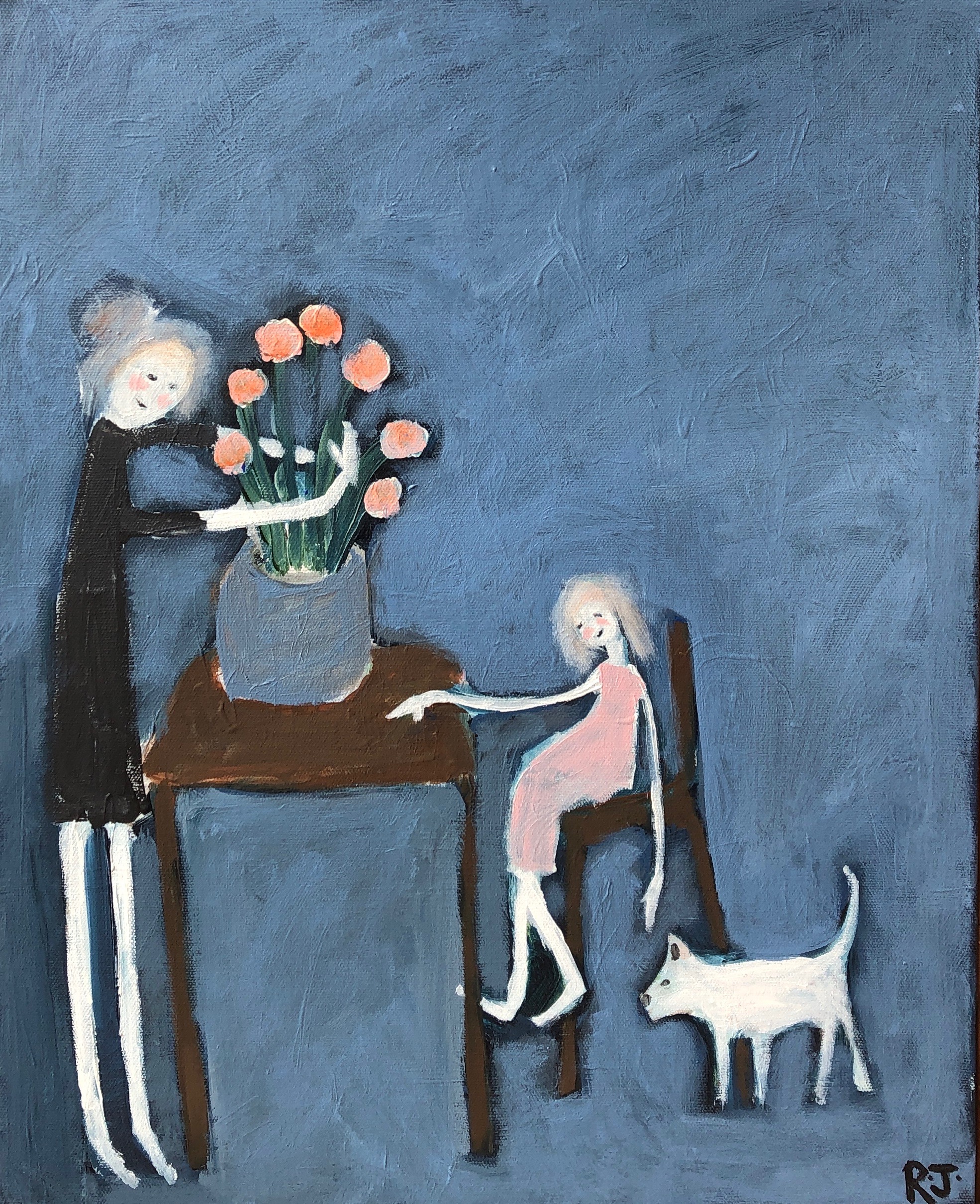 I hope that my art captures something true about the world — the beauty of the ordinary, the complexity of human interaction, the intensity of an emotion. My art is largely figurative, people and things, and I attempt to represent what I see and experience with a sense of appreciation and humour. My work is often colourful and illustrative and can tend towards the naive. It frequently has elements of fantasy about it. I like my art to tell a story, to prompt the viewer to think ‘I know exactly how that feels,’ or to inspire a sense of joy or longing or nostalgia.