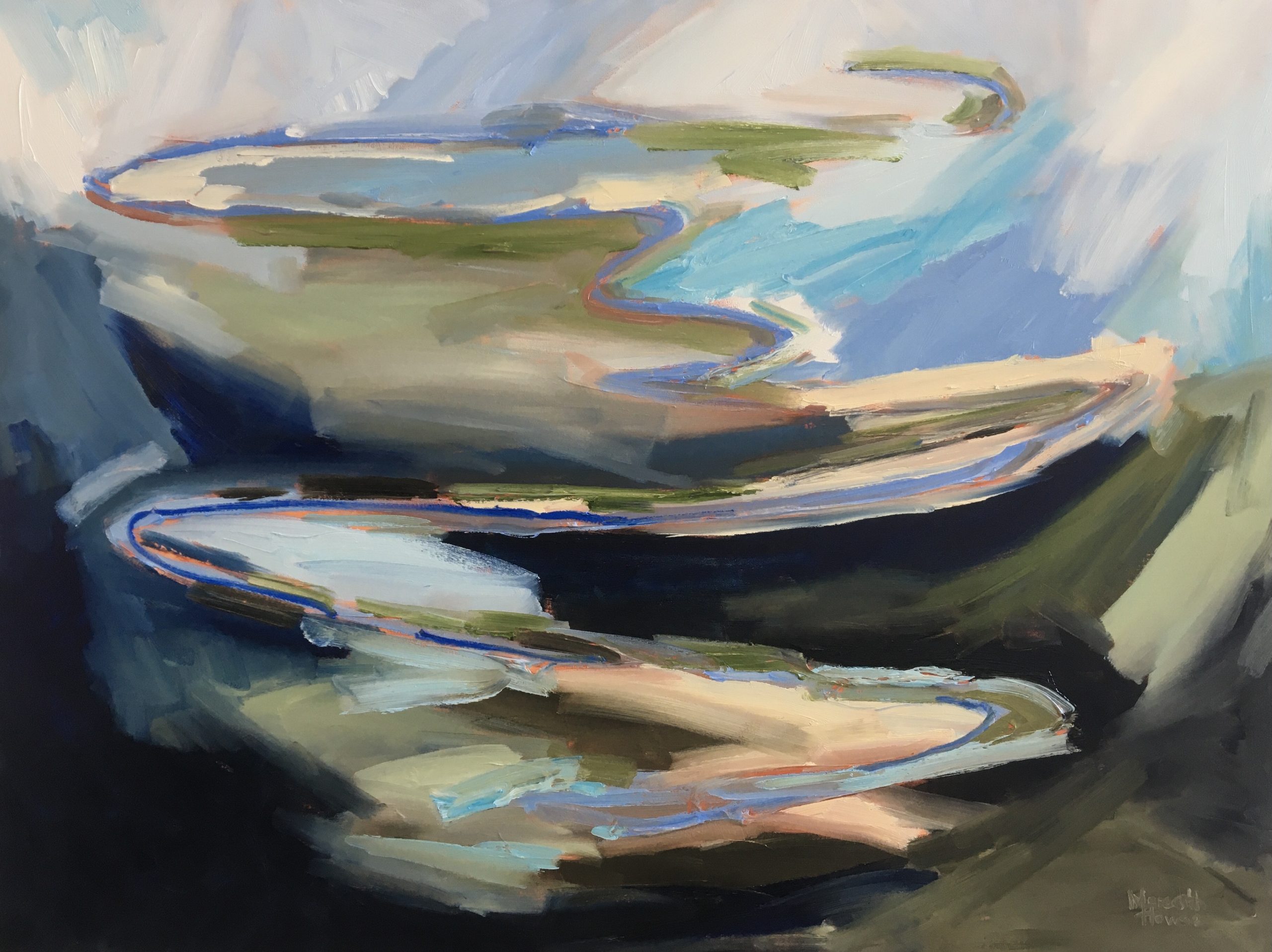 Her Green Path Home artwork by Meredith Howse. Forms part of new and exciting series of artworks by Meredith Howse, part of a sophisticated collection of abstract landscapes using rich deep greens, earthy browns and warm ochre’s, with a splash of blue to symbolise our rivers, dams and blue sky’s. A birds eye view point on a textured, well primed canvas. Connections are made between colours and lines.