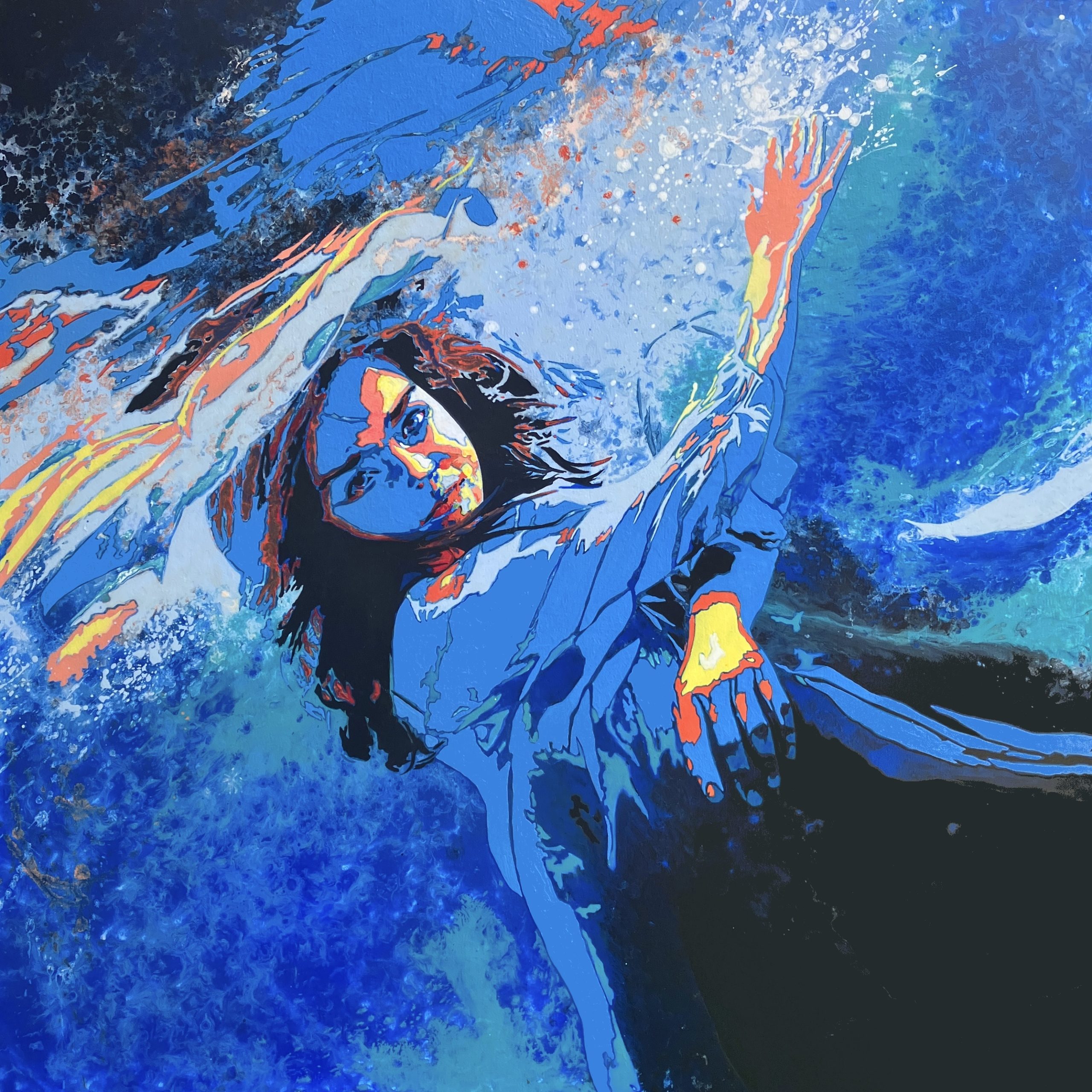 Kerry has used a contemporary approach using techniques such as expressionism and pop art to capture her model in contrasting colours of red, orange and blue. In this square composition of an underwater world, the light highlights her hands and face as she bobs just under the surface.