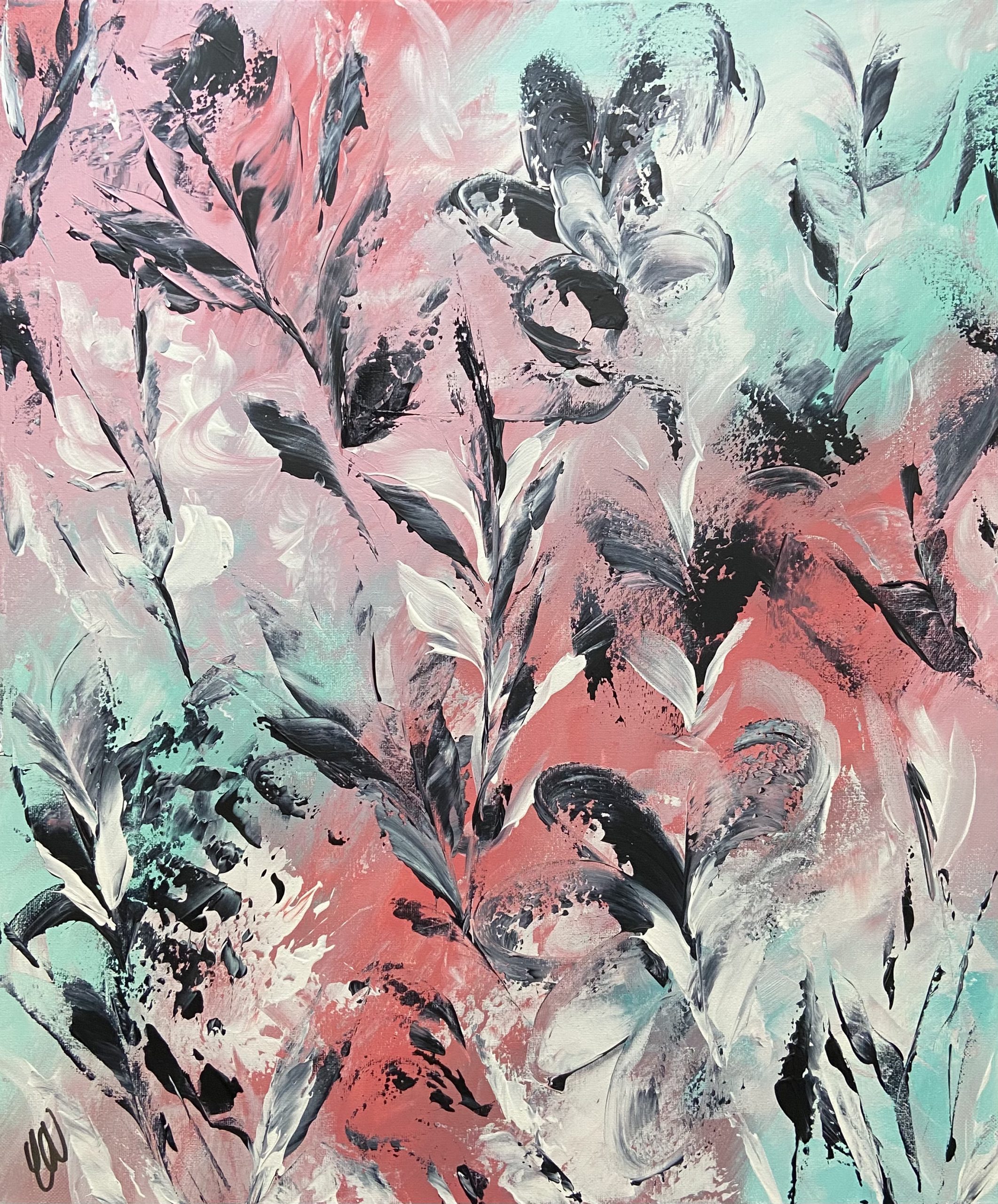 Here And Now by Carrie Welsh is a beautiful abstract botanical piece that has an absolutely stunning colour combination. This artwork will be a beautiful addition to any space in your home or office!  60 x 50 cm. Acrylic on canvas, ready to hang. Some images show what this painting will look like framed. Frames not included.
