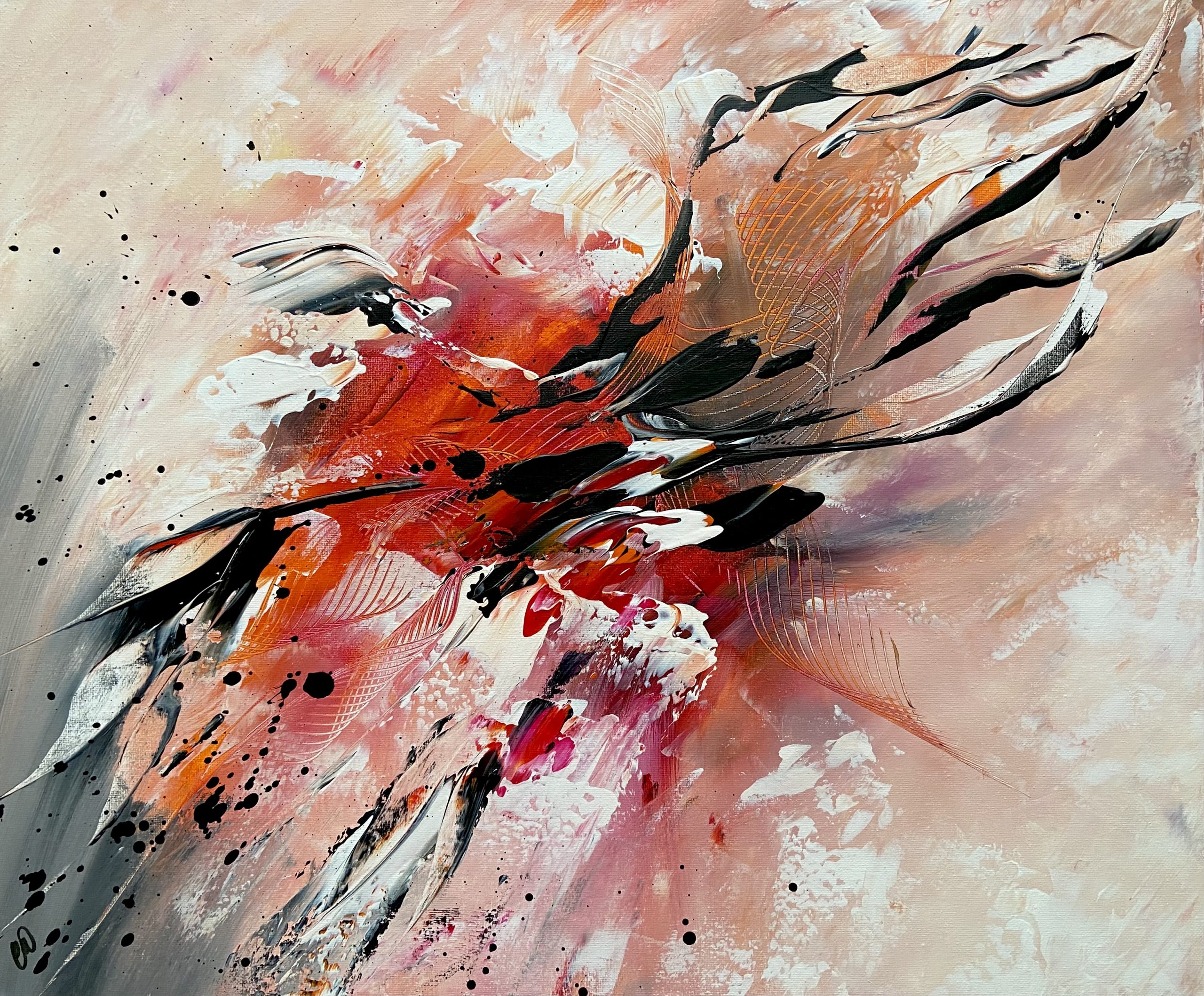 Here At Last by Carrie Welsh is a very beautiful and striking abstract piece. A stunning warm colour combination that will bring life to any space! 60 x 50 cm. Acrylic on canvas, ready to hang. Some images show what this painting will look like framed. Frames not included.