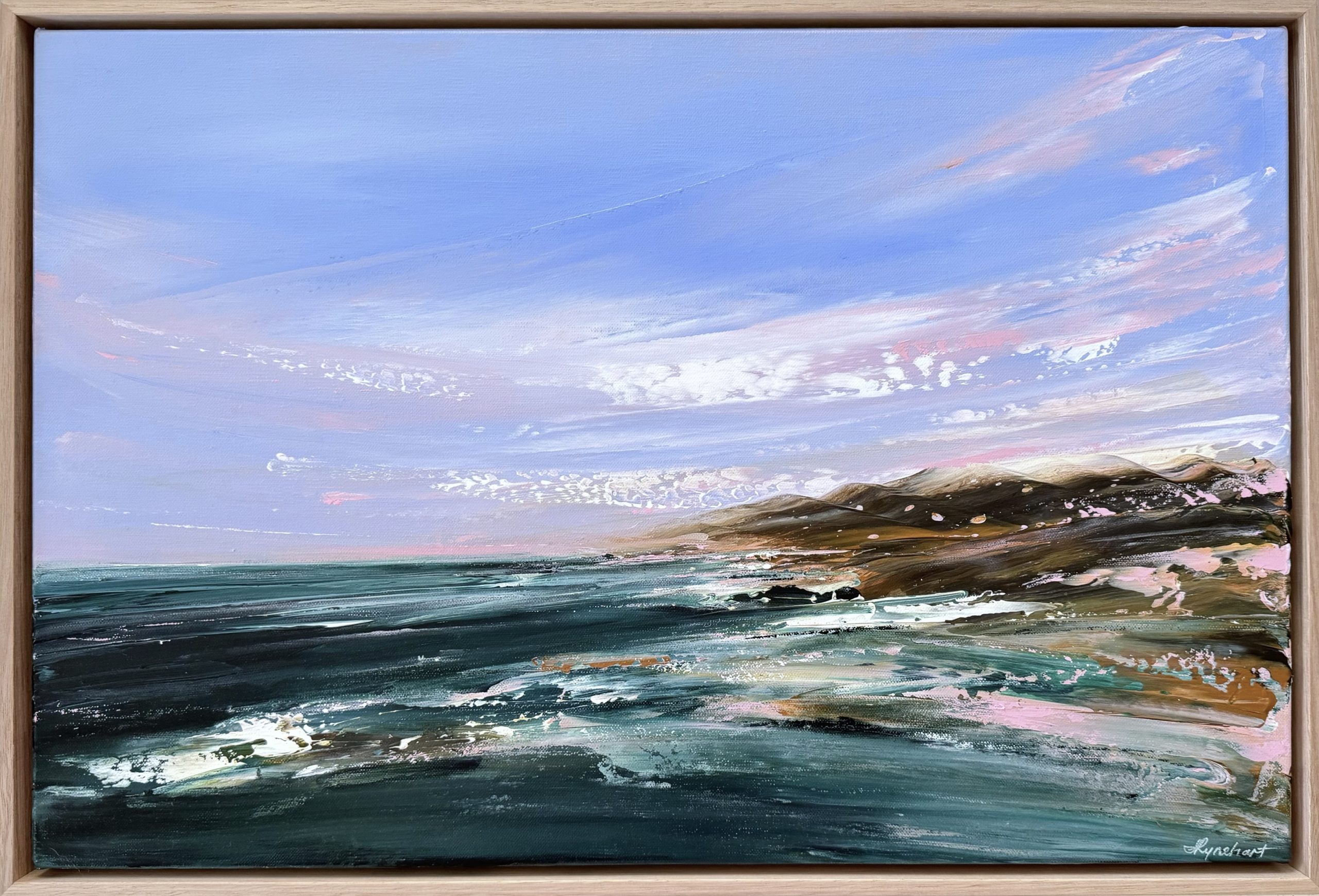 This expressive and beautifully colourful seascape has been painted with palette knives on 500 gsm stretched linen, and is framed in a solid oak timber frame. It has been satin varnished and will come with a COA.