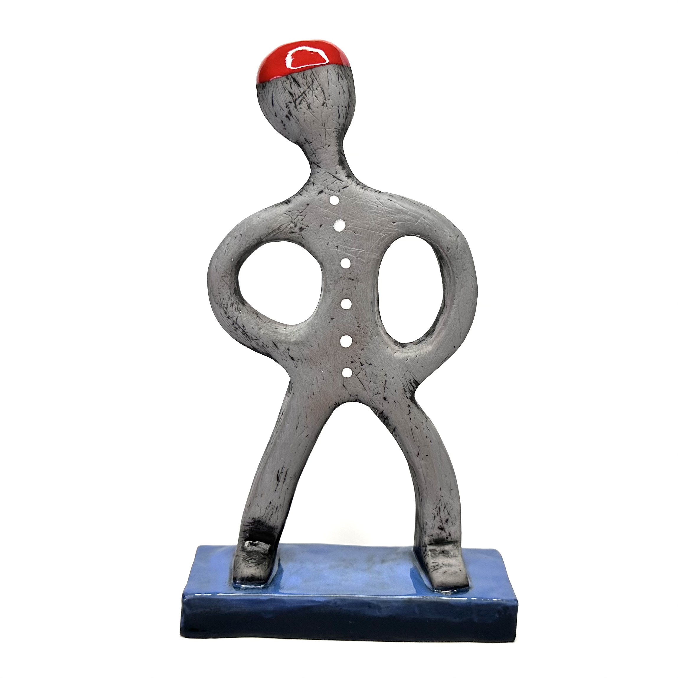The work, modelled from dense black clay, presents a standing spirit figure with a bright red crown and six white dots running down the front.