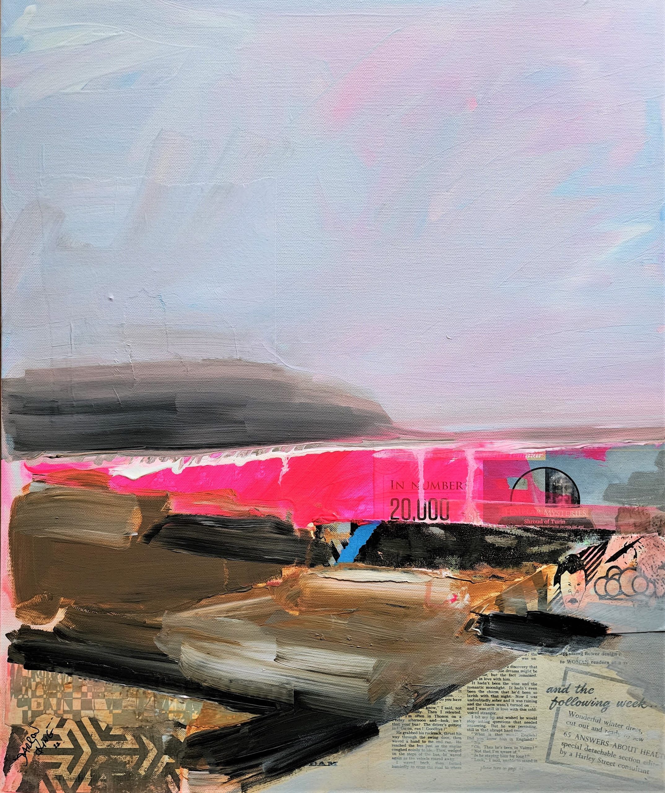 Most of the collage elements are taken from test prints of a couple of my multi layered screen print experiments printed over the years. Cut up, reassembled and over painted to create this piece. Recycled magazine clippings have also been added. The layered collaged elements create a textured surface that would be impossible to create with just paint.
