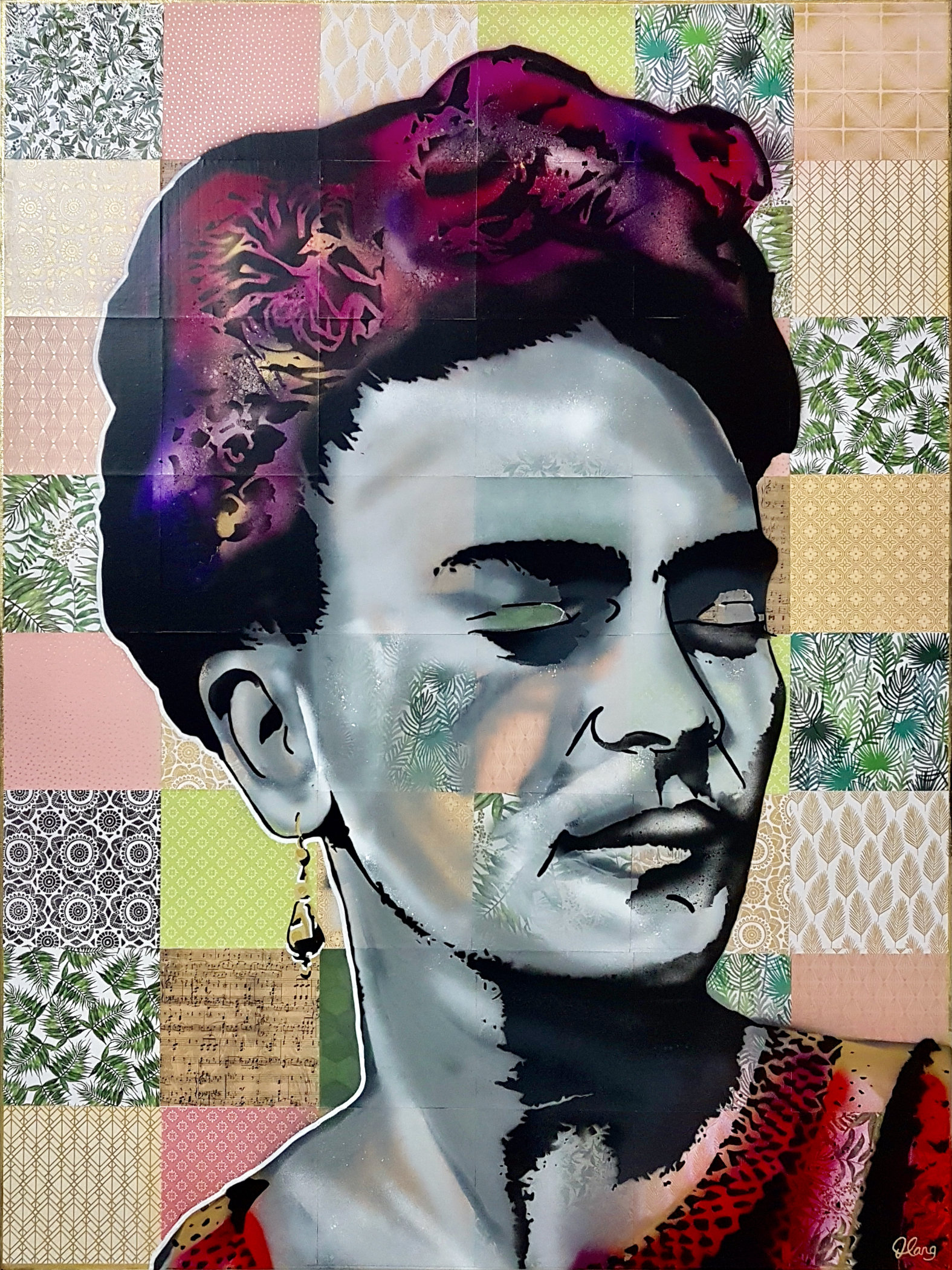 Layers of Spray paint have been applied using stencils and free hand followed by line details to make her pop creating this striking effect on top of decorative paper which has been laid to look like Mexican tiles attached to stretched canvas.