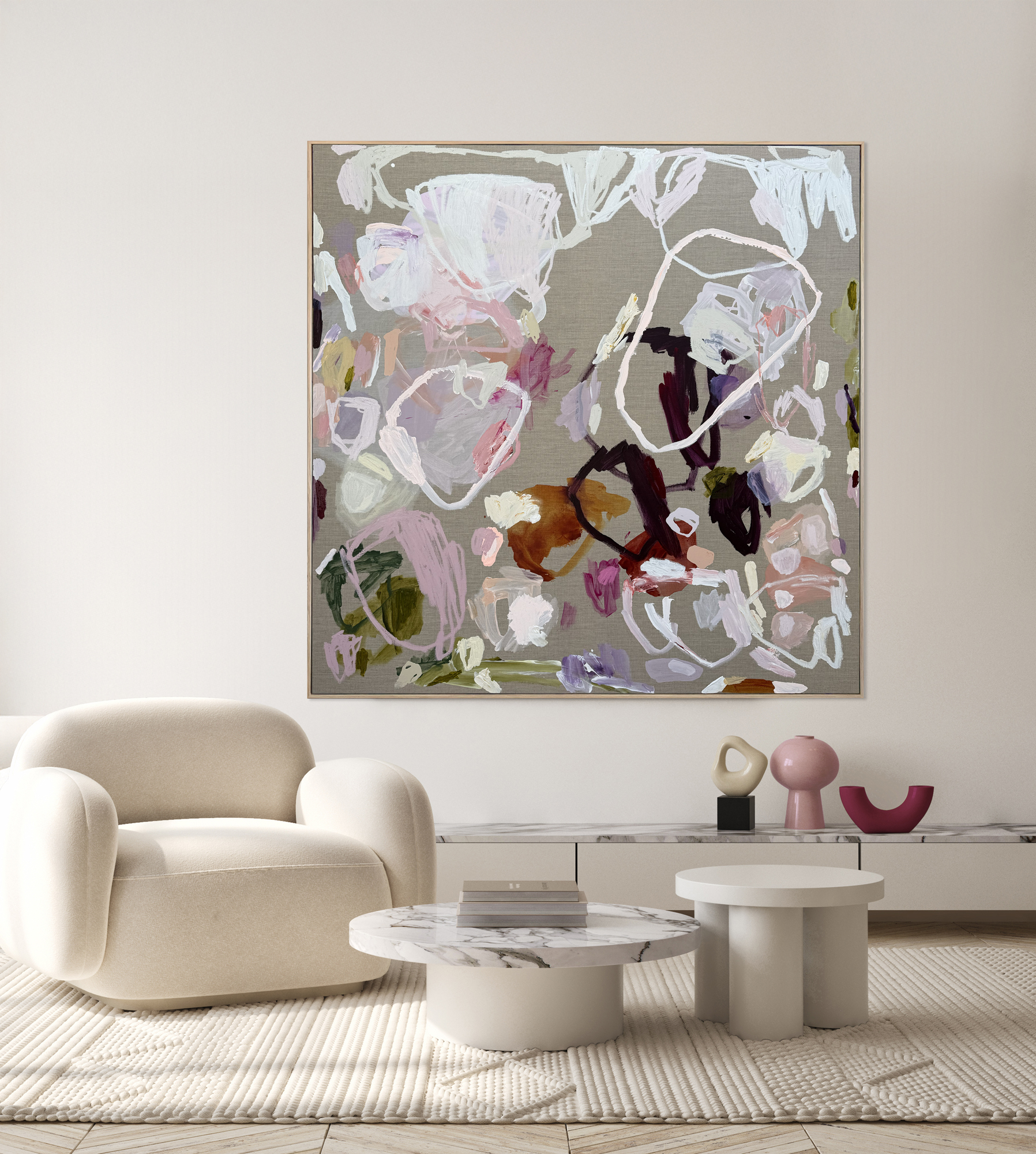 Painted on raw natural linen, the palette moves between warm pinks, muted neutrals, and deeper earthy tones. It’s full of subtle shifts and layered gestures – some bold, some barely there. Together they create a rhythm that unfolds the longer you sit with it.