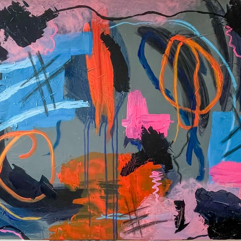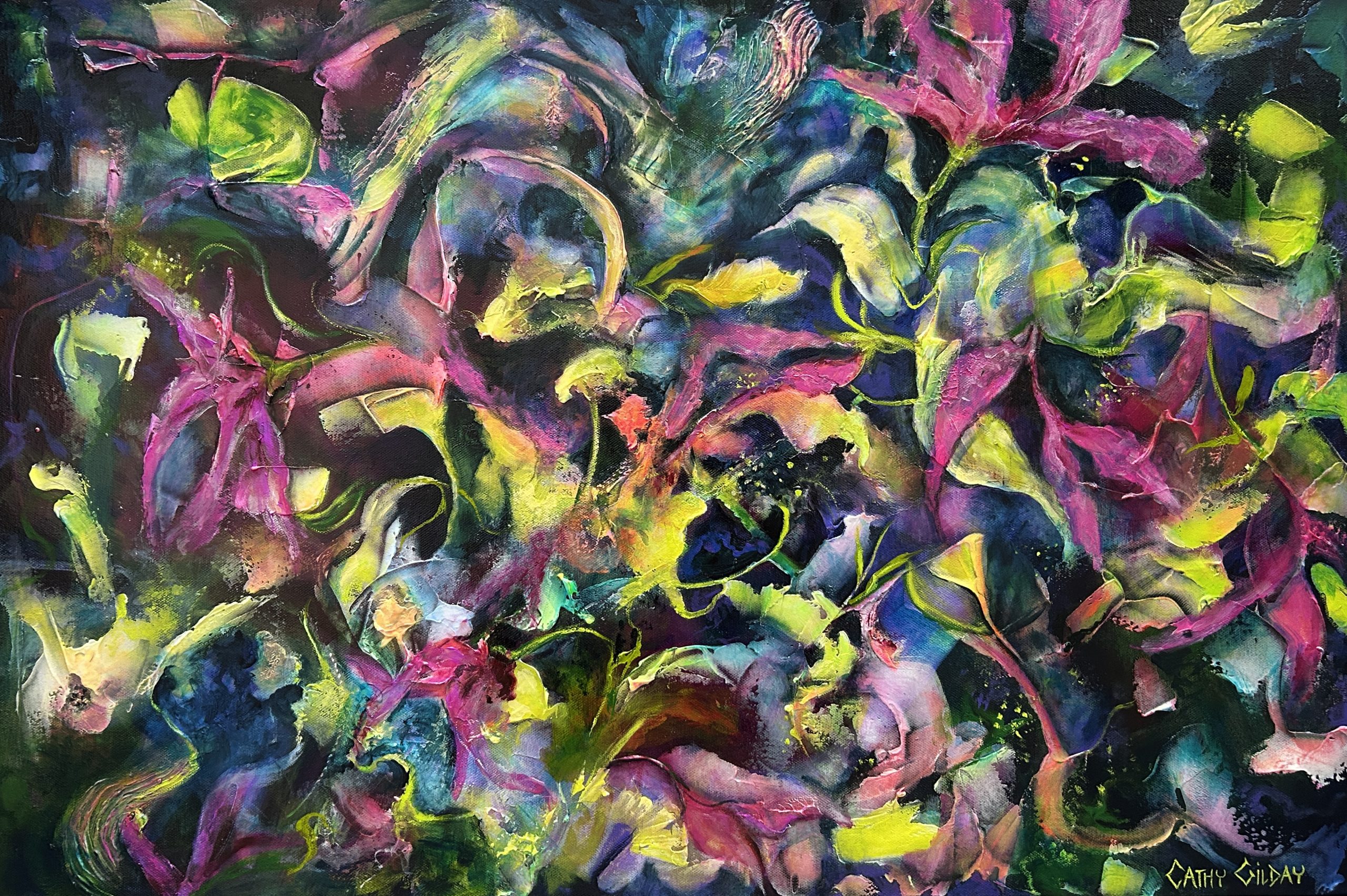 A floral abstract expressionist painting in bold hi vis colours, set against a deep background. I have used many layers of overlapping coloured glazes and purposely exaggerated the brushstrokes and texture, which adds to the movement and flow in this continuous pattern.