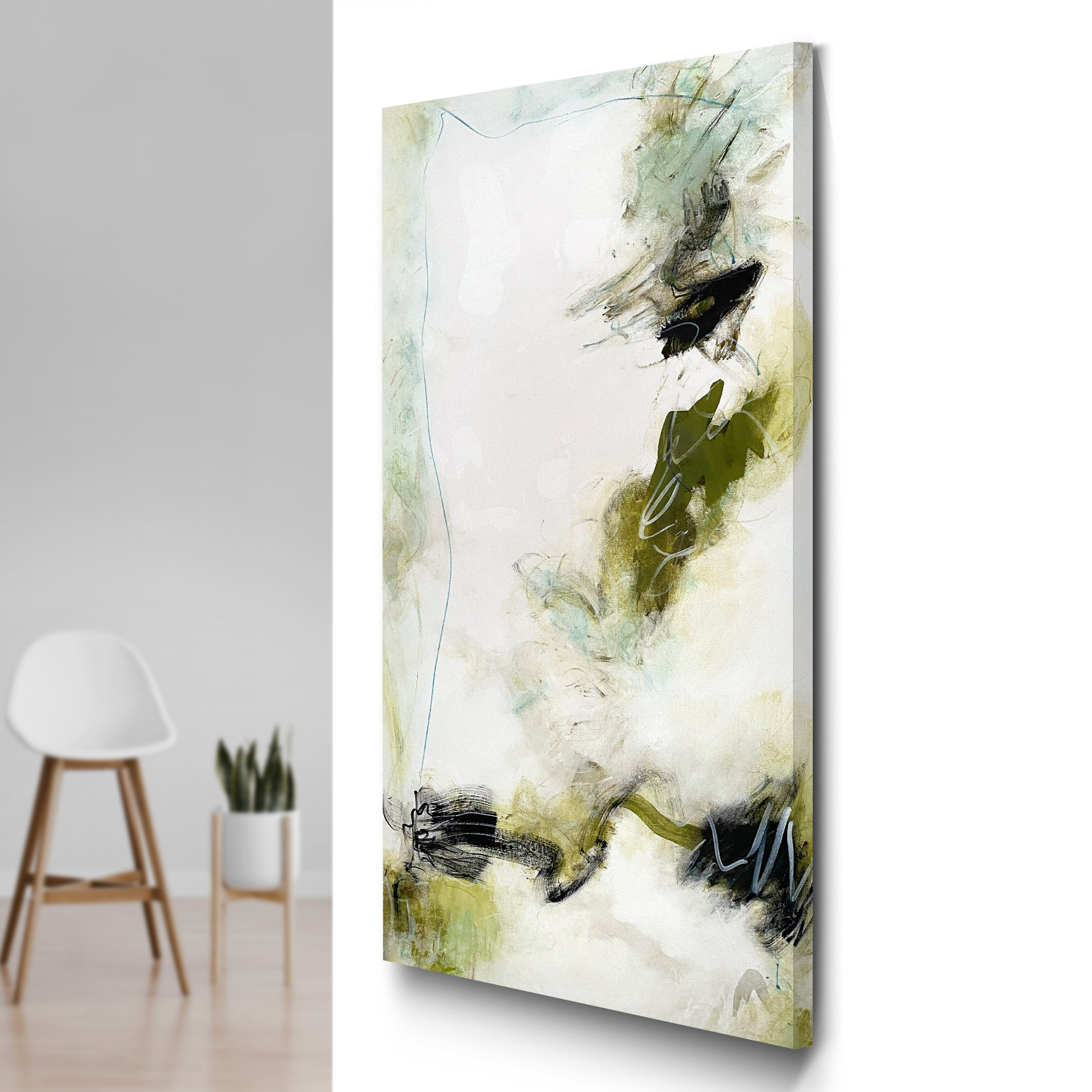 It’s intriguing expressionist mark making combined with its vibrant, limited palette of green, black and white with hints of warm tones makes the ideal painting for a vertical space.