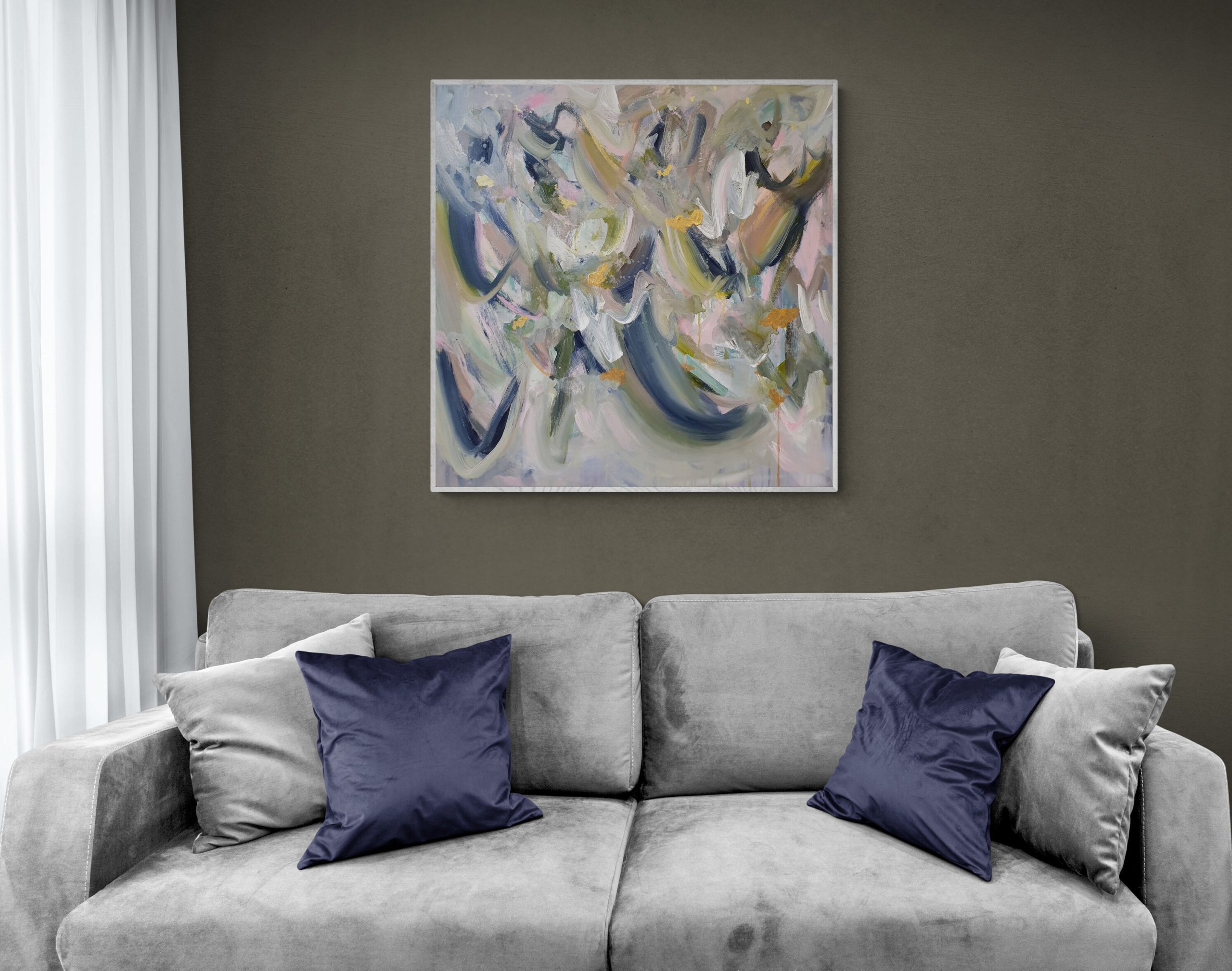 A golden sparkly original painting on canvas from my ever evolving mixed media collection ‘Fragments’. It shines bright in different lights with the 24 karat gold leaf speckled throughout.