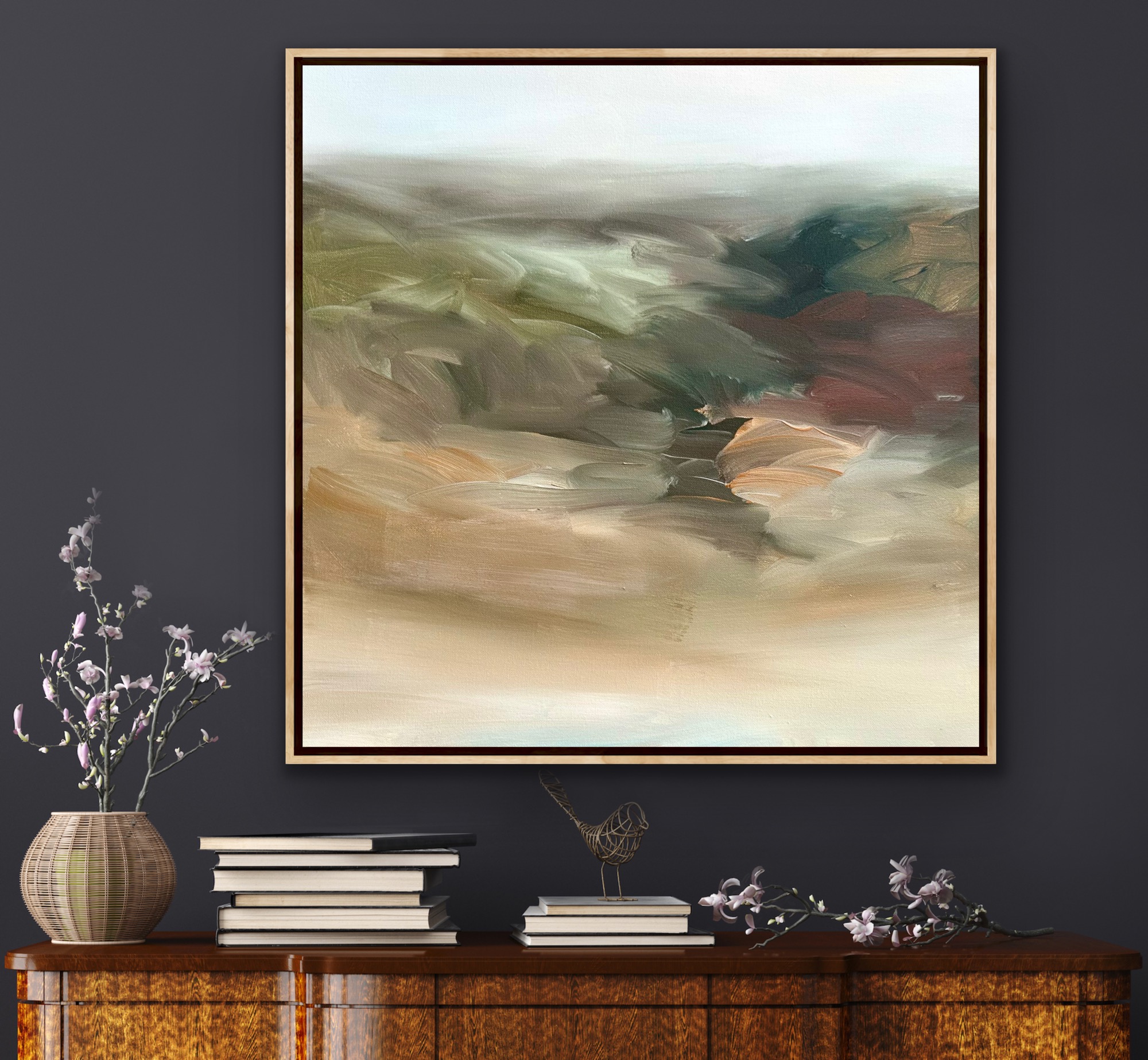 Hidden Valley by Theo Papathomas a painting celebrating colour and light of the Australian landscape. A very soothing and tranquil painting where sky, clouds come together to create this beautiful harmonious landscape. Capturing the beautiful colours of the Australian landscape , browns, olive greens and pastels against the light colours of the sky. Clouds covering the hills and capturing the beautiful rhythms of the landscape as the sun goes down .Painted in a very expressionistic way with acrylic paints, with lots of layers of paint . I tried to create so much depth in the painting .A very harmonious composition of colours and forms that makes it a very poetic painting . This painting does not come with an external frame.The painting is signed and dated 2023 at the back and comes with a certificate of Authenticity.