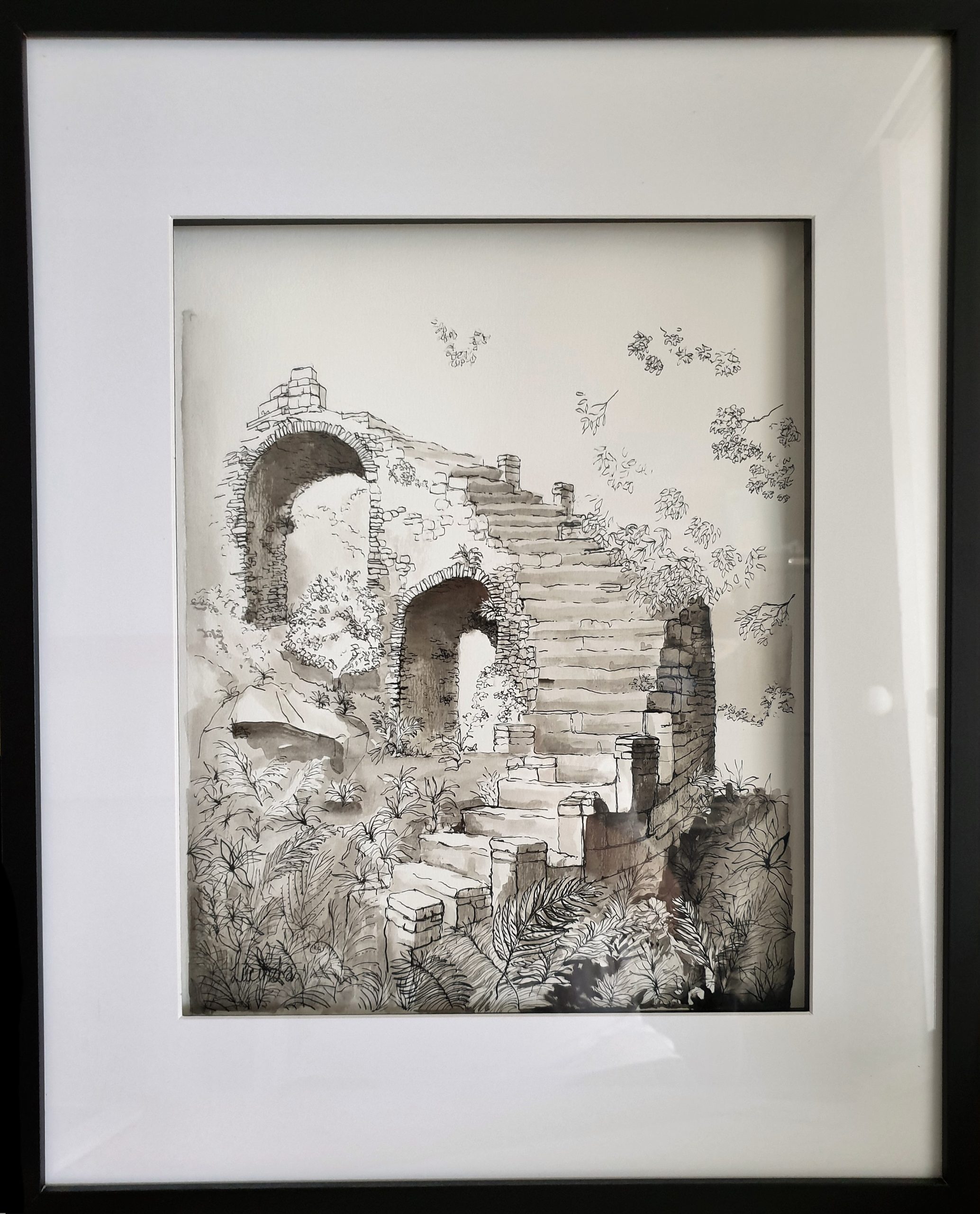 Pen and wash is quite an ‘old’ medium, in that it has been around for such a long time. When I was at art school I did quite a few pen and ink/wash works and developed them after I left. I didn’t really follow through the exploration of this gorgeous medium, so thought it was about time to revisit. I will be producing a series of these pieces with stone ruins, steps and garden follies as the subject matter using the old fashioned dip pen and nib, paint brushes and some of the newer mediums that you can add to ink to make it perform in a more contemporary fashion!