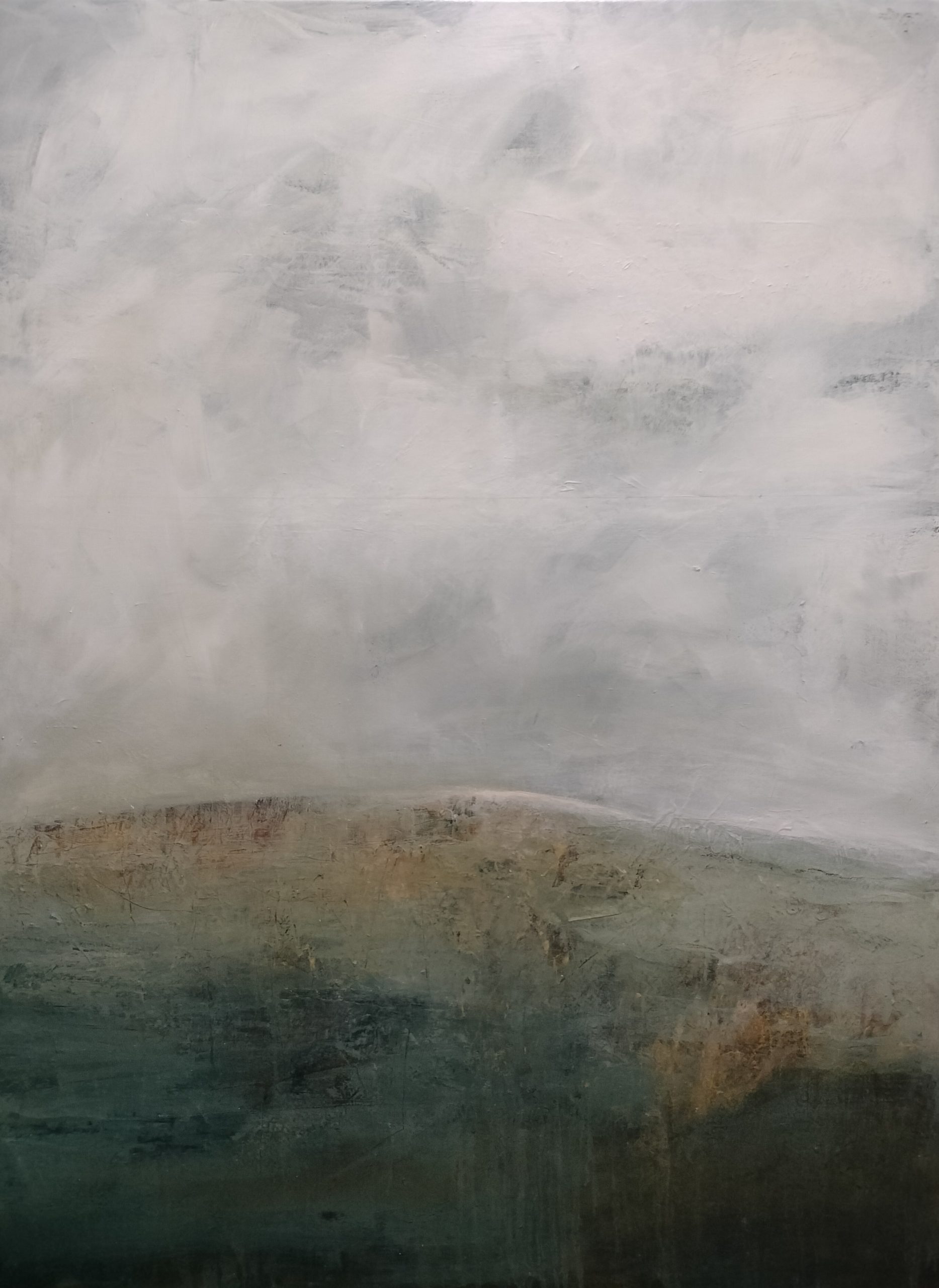 “Higher Ground” captures the essence of a serene countryside shrouded by cloud with a hint of sunlight at the peak of the verdant landscape. Wisps of clouds drift lazily overhead, adding a sense of depth and tranquility to the scene. Through subtle nuances of color and light, the painting invites contemplation and evokes a sense of upliftment, as if ascending to a higher realm of beauty and serenity.