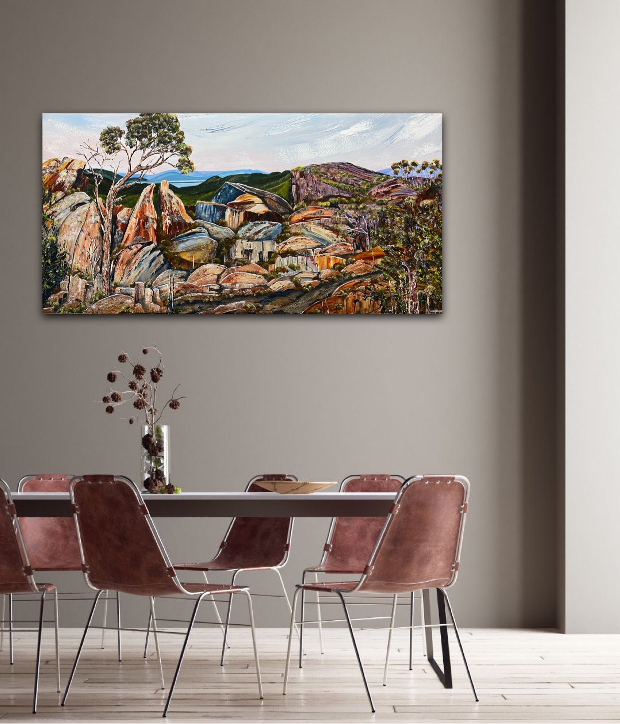 I love painting contemporary pieces which have a unique style yet each have their own individual look. I painted this artwork with inspiration taken from one of my daughters panoramic photos of a hike she did in the Western part of Victoria in the beautiful Grampians near Halls Gap. I have used some texture so it is beautiful and tactile. I spent a great deal of time on this landscape to bring it to life. Our wonderful Australian landscape in the beautiful western part of country Victoria in a contemporary and fresh way. I love to create colourful rocky cliff faces with the lovely earthy colours & then our beautiful countryside in complete contrast green rolling hills and a river running through our rich earth part of this vast Australian country we call home.