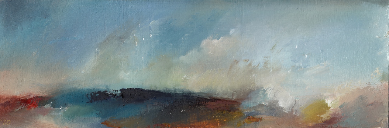 Hill Amongst Clouds – One of my favourite paintings so far, this depicts an empty, barren hill surrounded by low hanging clouds. I painted this on a rough piece of wood because I love the texture it added to the painting. I intentionally cut the wood into a thin long strip, to allow the clouds full rein of the painting.