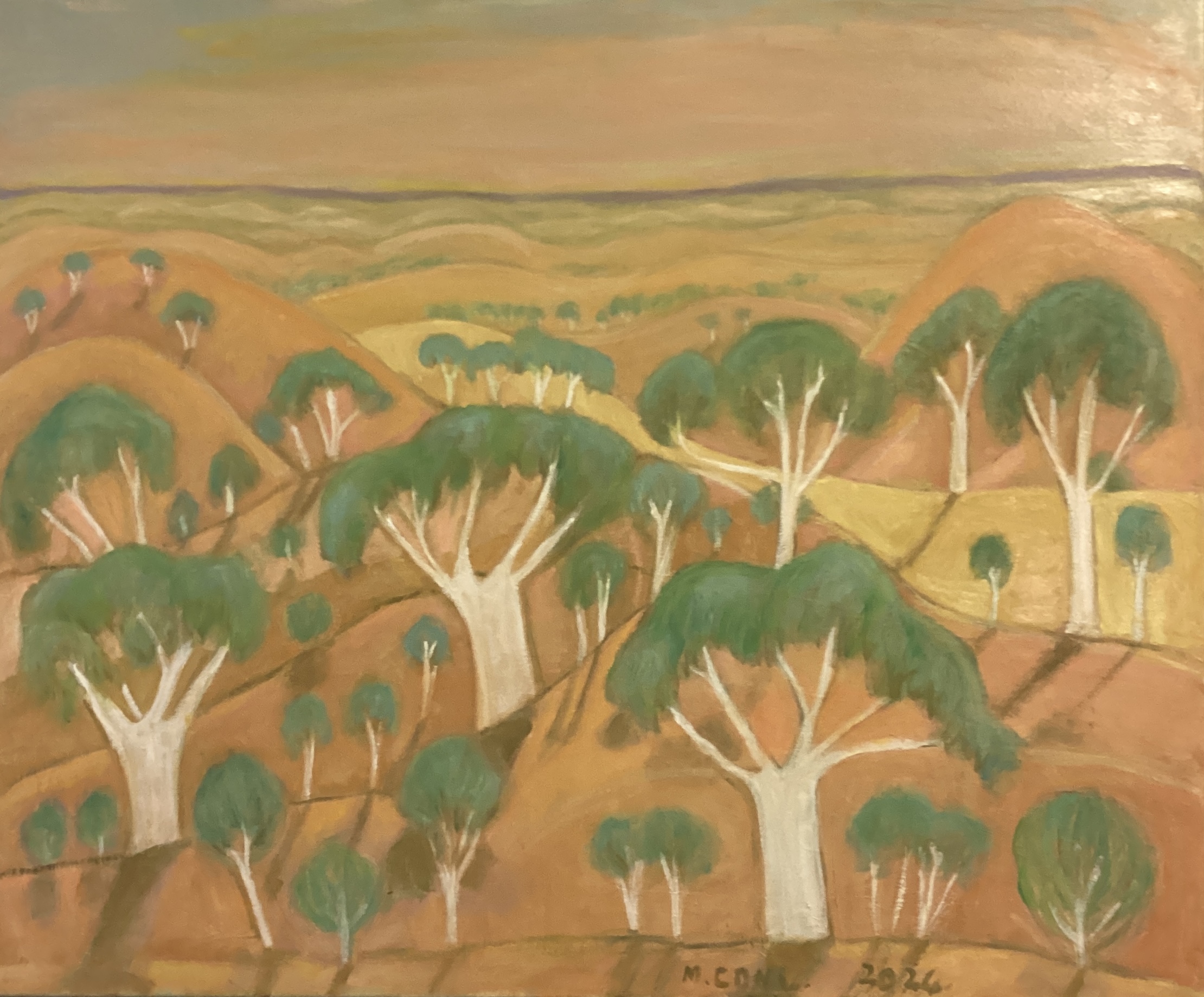 An original painting inspired by Margaret’s love of colours and her experience of living in remote parts of Australia. Margaret wanted to create the glaire of remote outback country. The canvas has been professionally made with canvas gessoes.D hooks have been placed on the back and it’s ready to hang but does not have an external frame.Good Quality oil paints have been used and the panini tin sealed with a light varnish sealant.