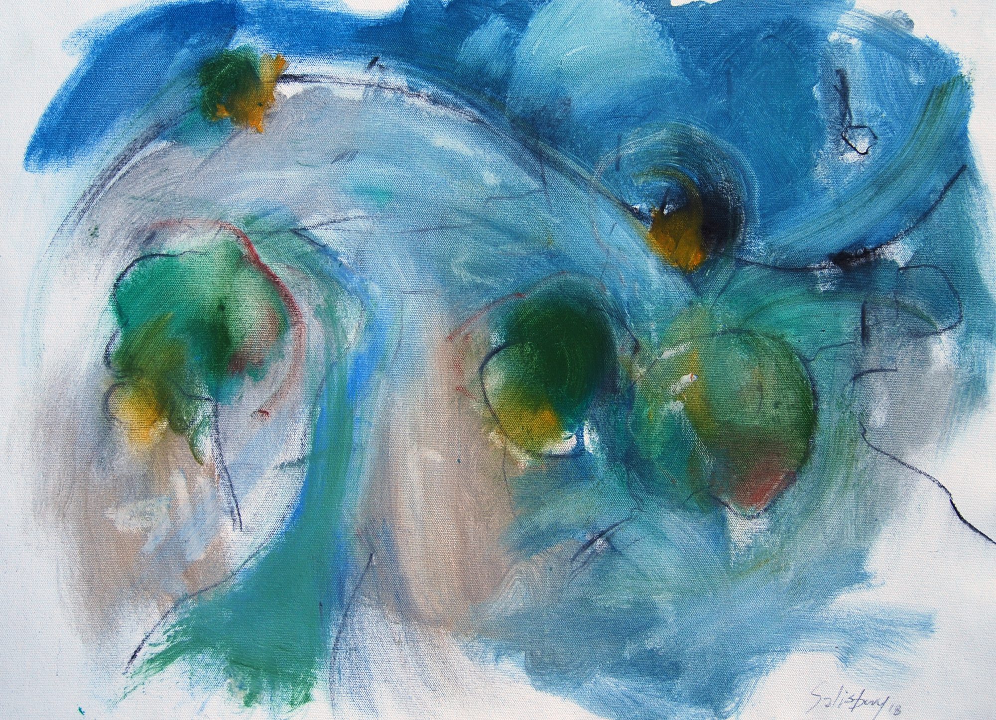 The hill with trees and things is a loose, energetic gestural work that flirts with figuration and abstraction.