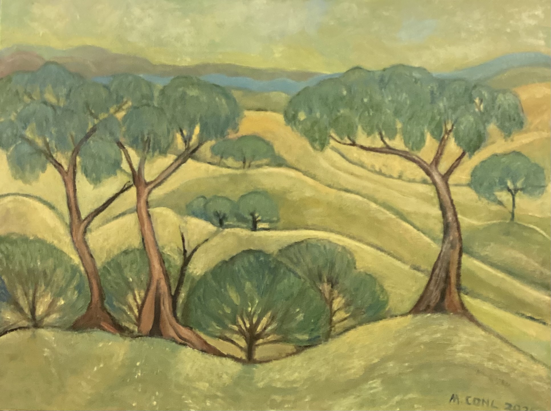Hills of summer – An original oil painting by Margaret Connell. Colouful image of golden summer hills with gum trees and bushes. This painting was influenced by Margaret’s memories of childhood riding in the back of a Chevrolet through the hills sight seeing in this case , thé hills of summer.Margaret loves to create brightly coloured paintings and in this one thé colours of summer.The painting would provide a good focal point in a room . Good quality canvas was stretched over à wooden frame and Art spectrum gesso used prior to the painting, done using Art spectrum oil paint and sealed with Art Spectrum glaze. D hooks are applied to the canvas that can be hung.