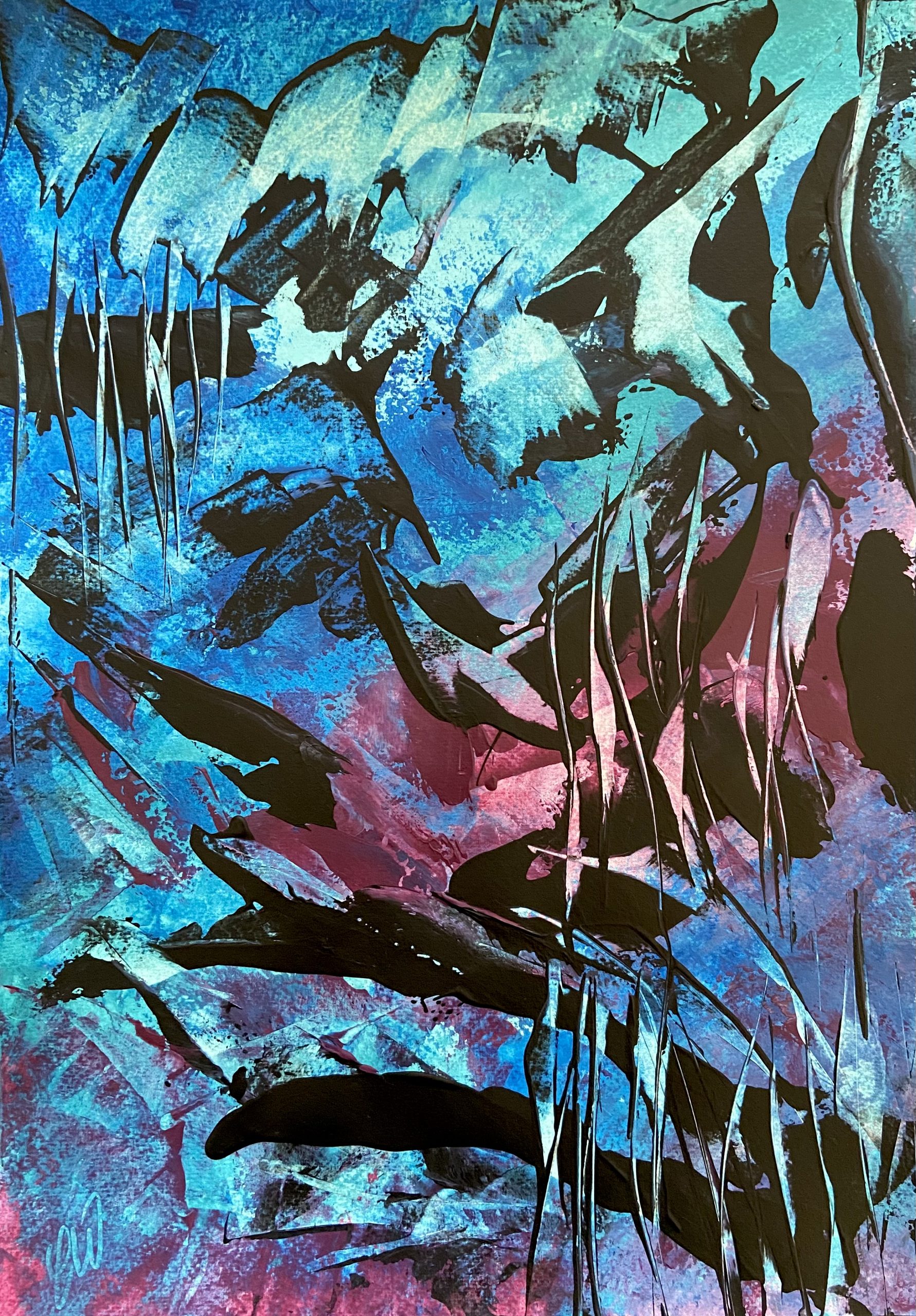 A striking abstract painting. Some images show what this piece looks like framed. Frames not included. 29.7 x 42 cm (A3 size) Acrylic on paper. Requires framing.