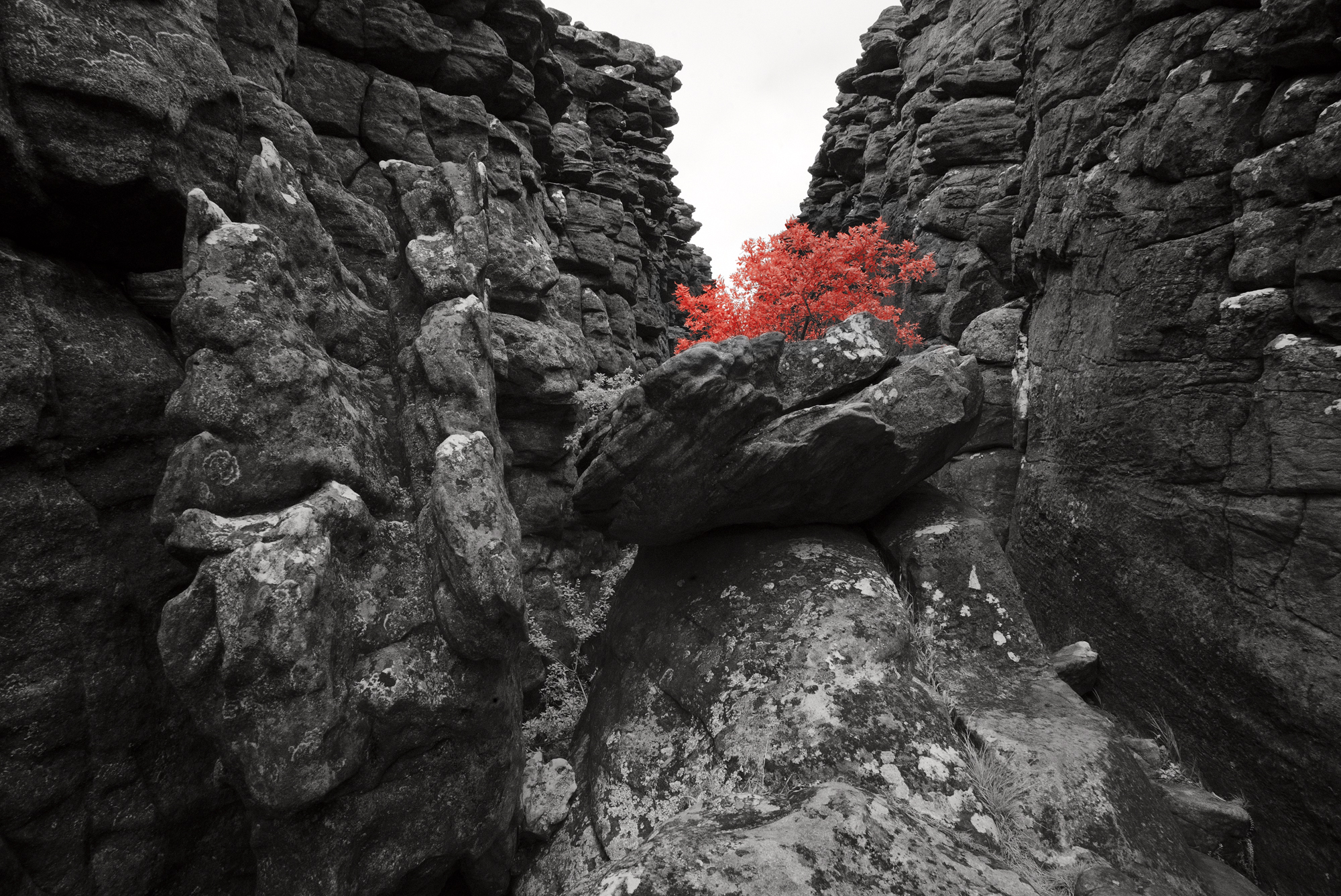 Selective colouring along with the converging lines of the stark, rocky surrounds, draws focus to the central bush.