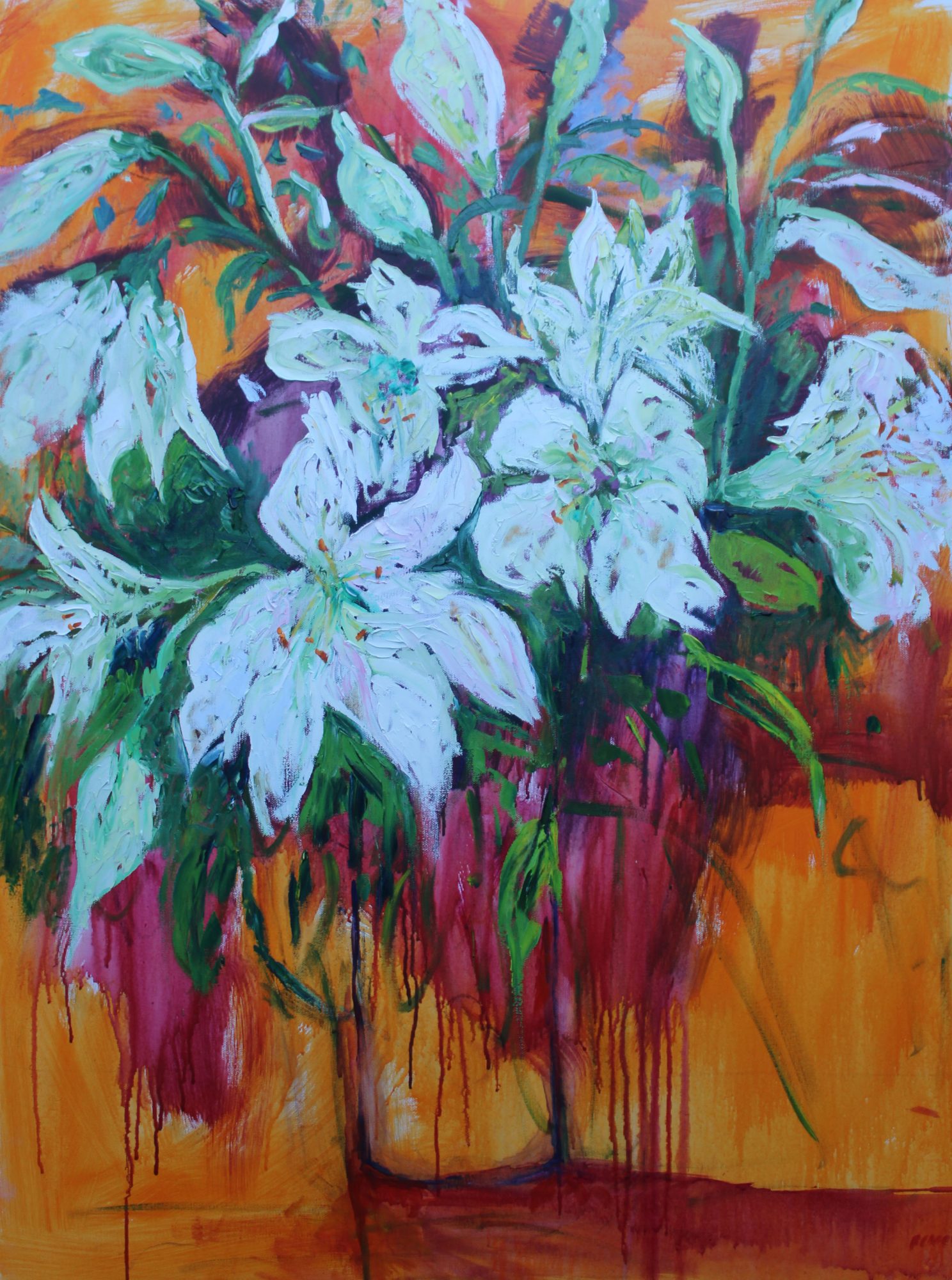 Original oil painting by Maureen Finck. I recently purchased a new car the the Salesman (young Ben) presented me with these beautiful St. Joseph lilies. I put them in a vase on my kitchen table, and just had to a painting of lilies. I did two paintings of lilies, one in acrylics and one in oils.