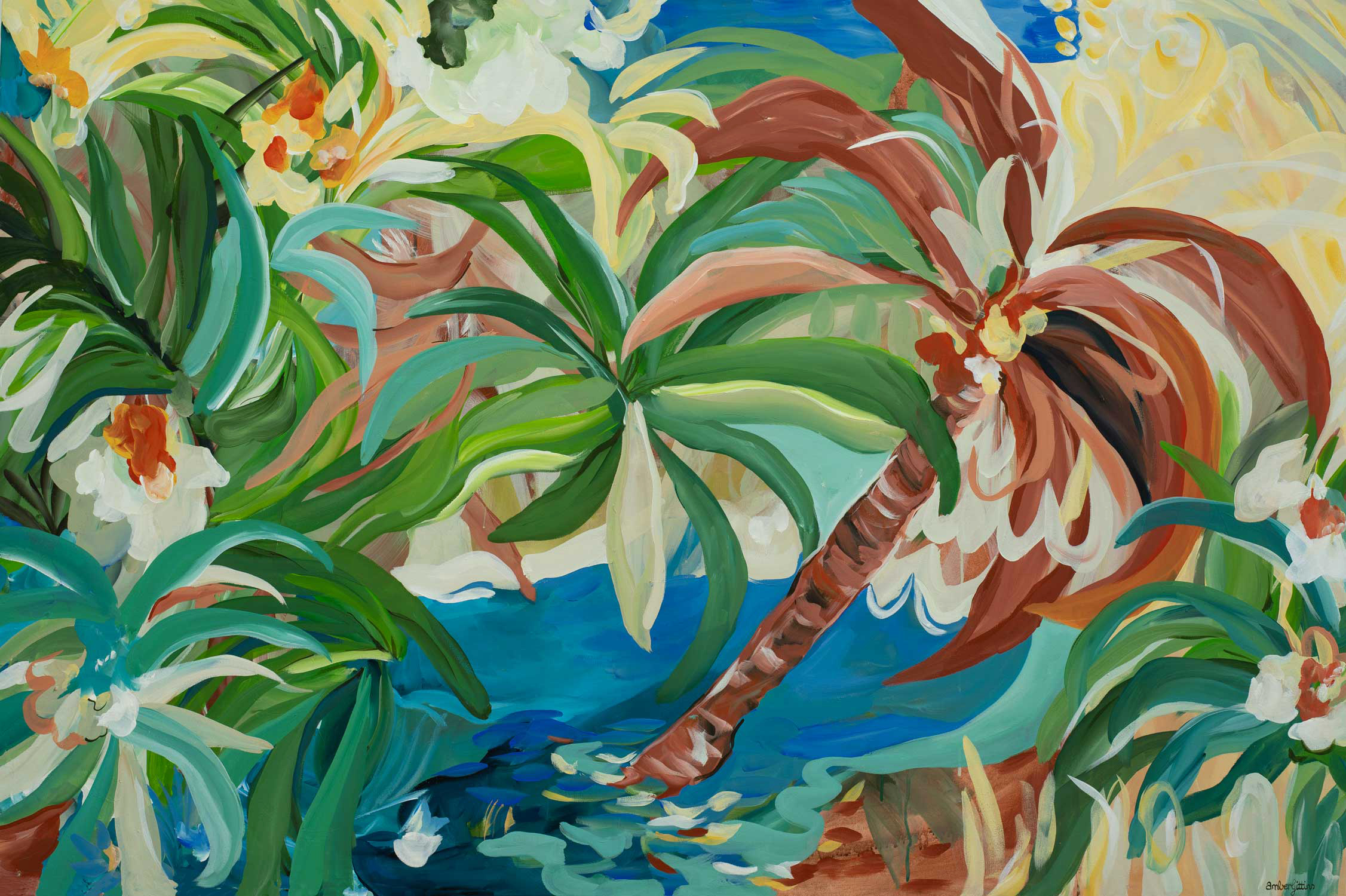 Holiday Vibes by Amber Gittens – In this expressive tropical oasis landscape, the vibrant acrylics intertwine in an abstract symphony, echoing the whispers of a lush tropical paradise. This piece is my ode to the wild and free, an invitation for viewers to dive into a realm where imagination blossoms under the sun’s warm embrace. Bringing this energy to your space, it promises to infuse your home with vivacity and a touch of the untamed.
