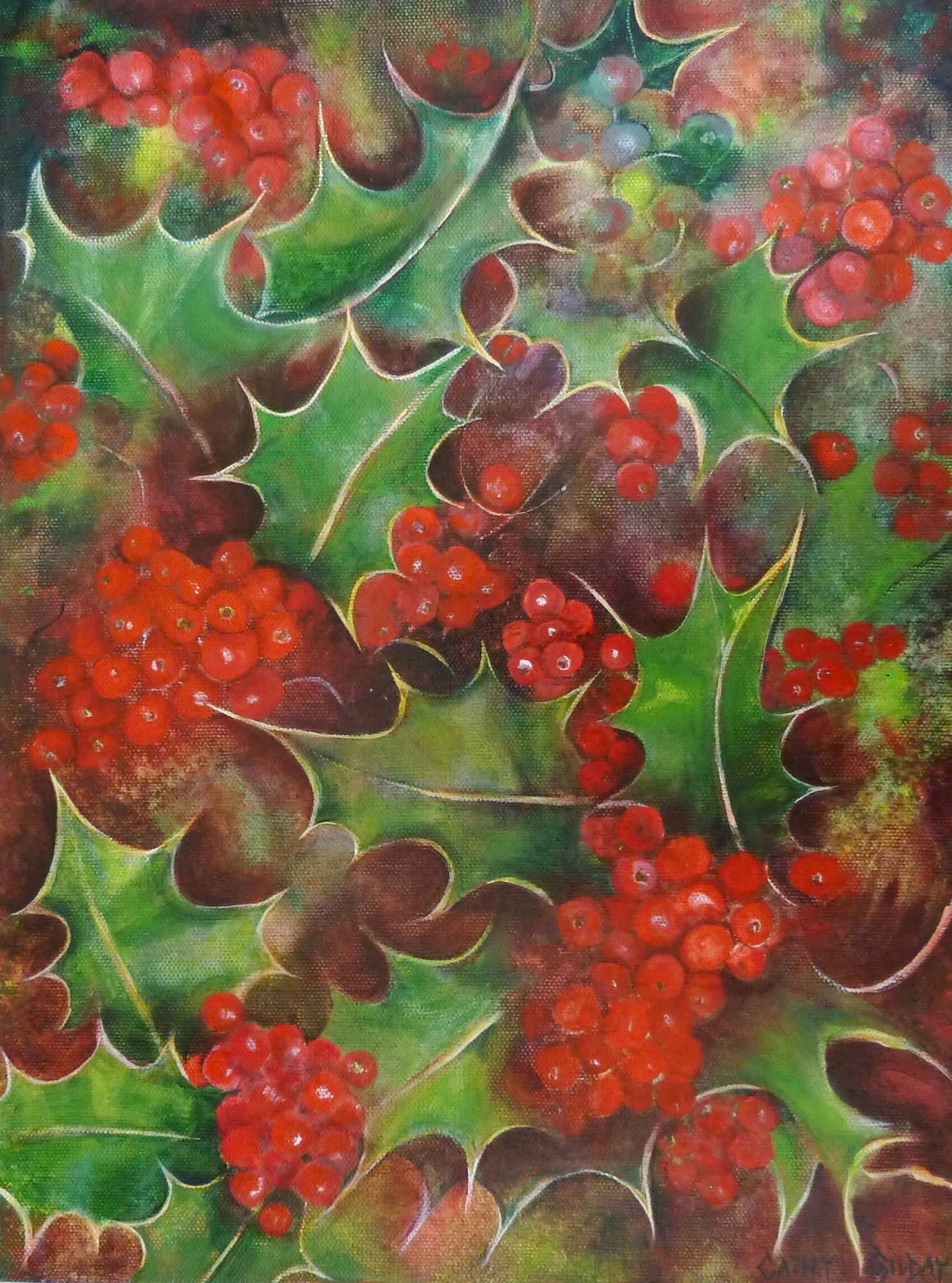 Holly by Cathy Gilday – An inspirational painting of Holly, to get you in the “Christmas Spirit.” This painting would make a lovely addition home or office decorations! Sides painted and sealed.