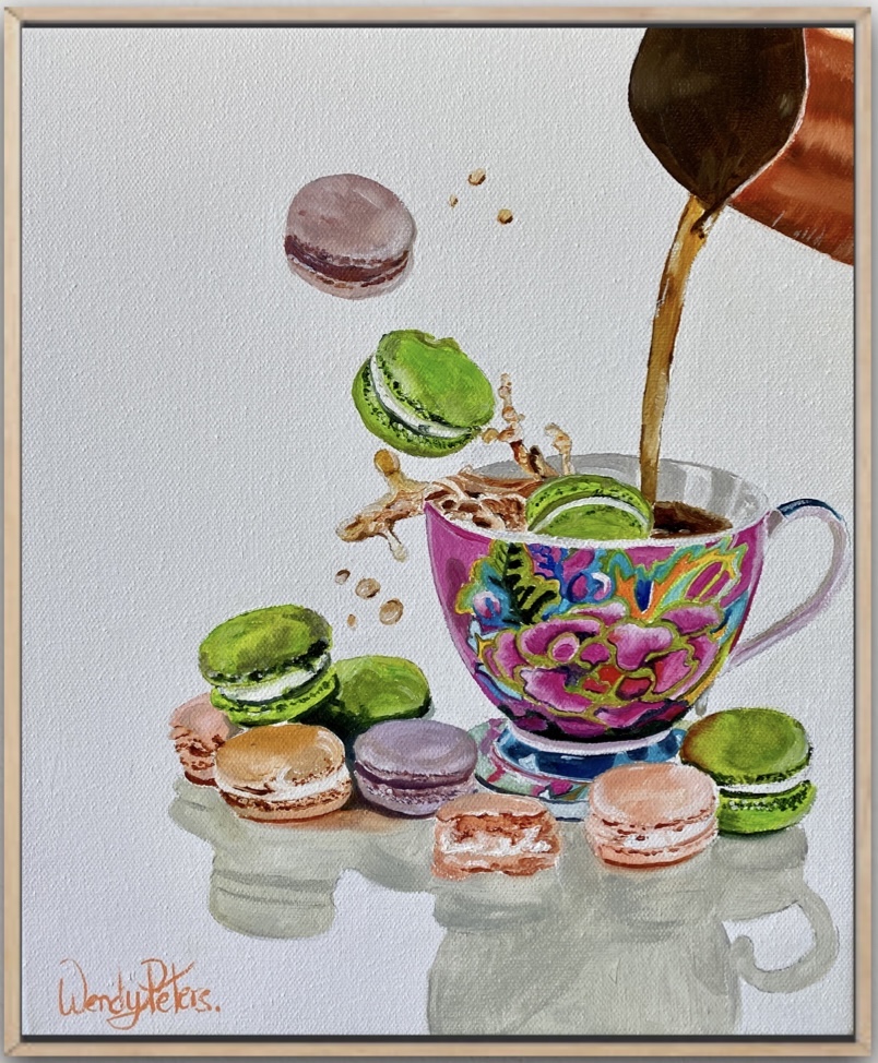 Holy Macaroon – i  by Wendy Peters – In this painting, the coffee cascades into the teacup like a graceful waterfall, sending ripples through the liquid as macaroons tumble in, creating a deliciously whimsical scene. The background is a crisp white. Framed in a Tasmanian oak float frame.