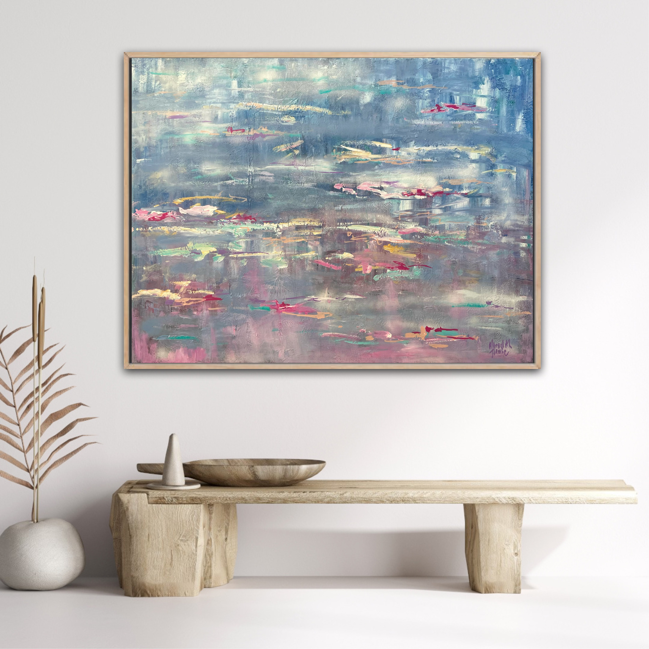 Immerse yourself in the enchanting beauty of an abstract water pond. Homage to the artist by Claude Monet and his beautiful garden in Giverny. This piece is rich with textured acrylic paint and dynamic brushwork.