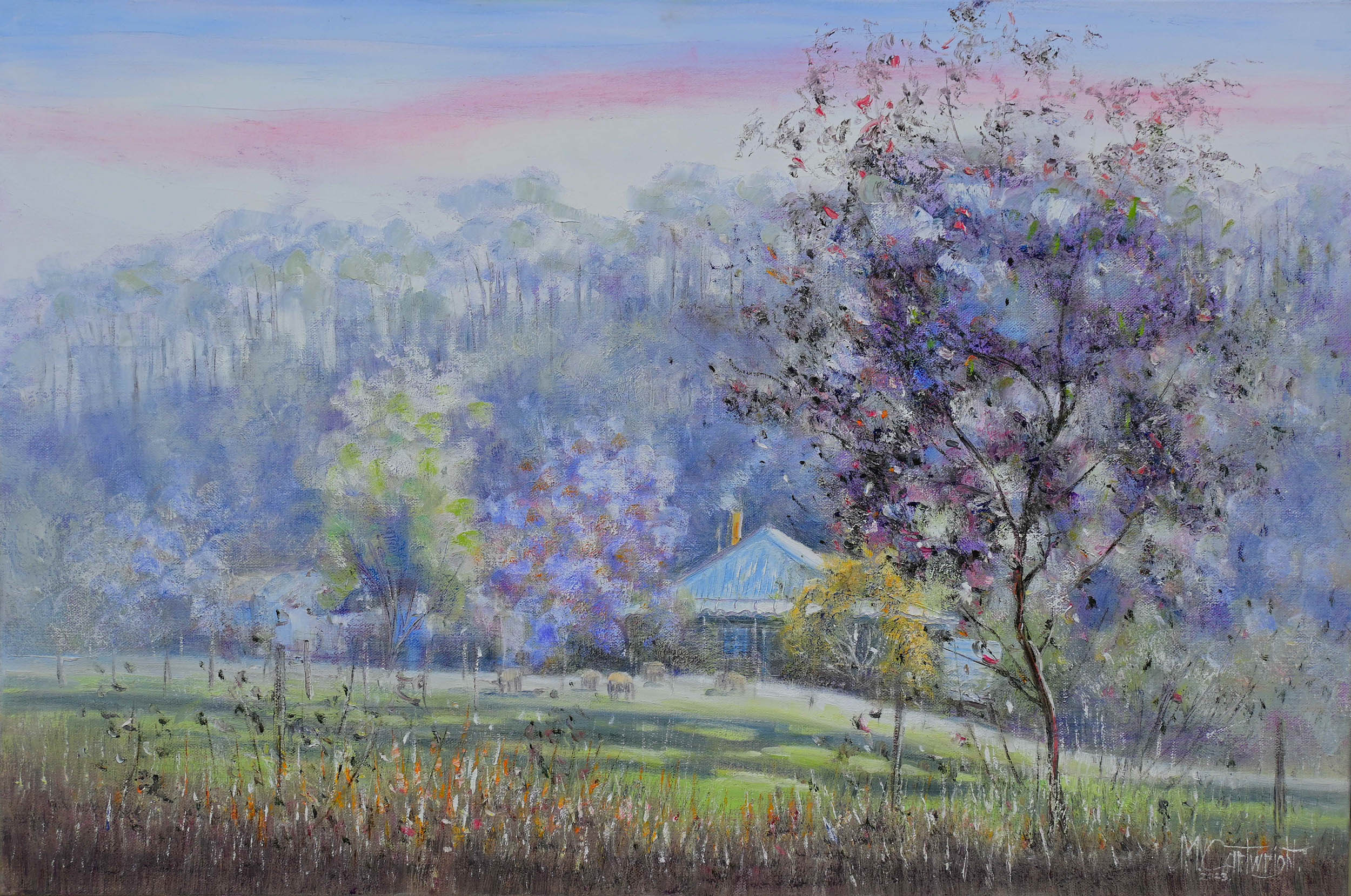 The afternoon light shines through the trees and across the land. A charming old farmhouse is nestled among surrounding fruit trees and bushes. I was inspired by the decorative patterns of light,shade and broken color throughout the scene. The location is the beautiful countryside of Mount Shadforth, Denmark, Western Australia.