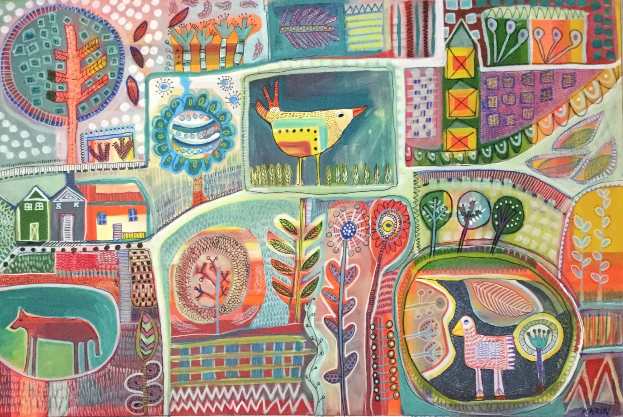 Whimsical  interpretation of the landscape with abstract shaped animals, nature, houses, and plant life. Portrayed in a fun joyful manner with a native twist. Colourful and patterned and expressive.
