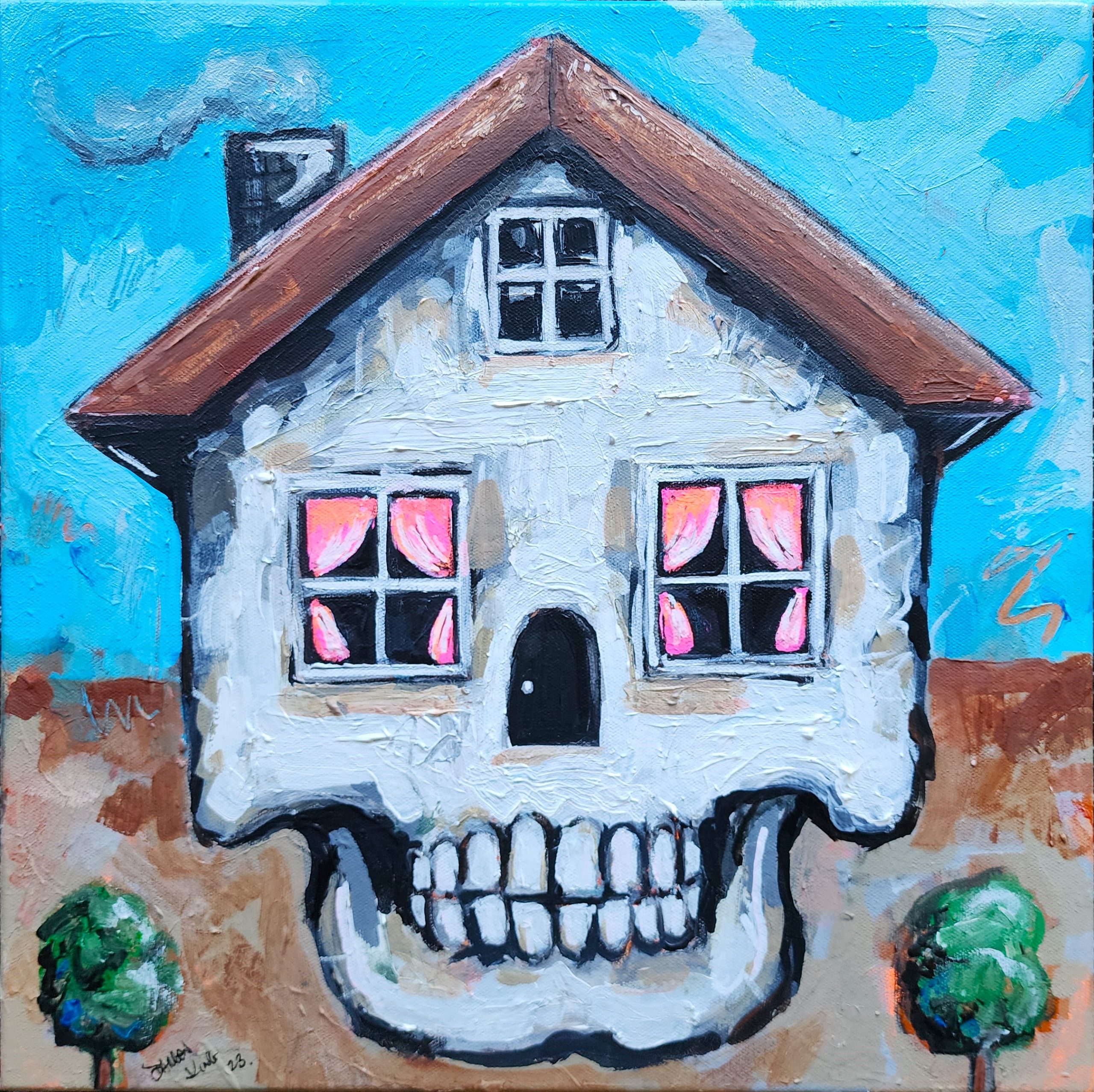 Home Sweet Home by Darren King – The piece is on stretched canvas frame. It has a wire at the back & is ready to hang. 2 coats of gloss varnish will be applied to protect the artwork & the gloss finish gives the piece a glassy finish. Skull fun.