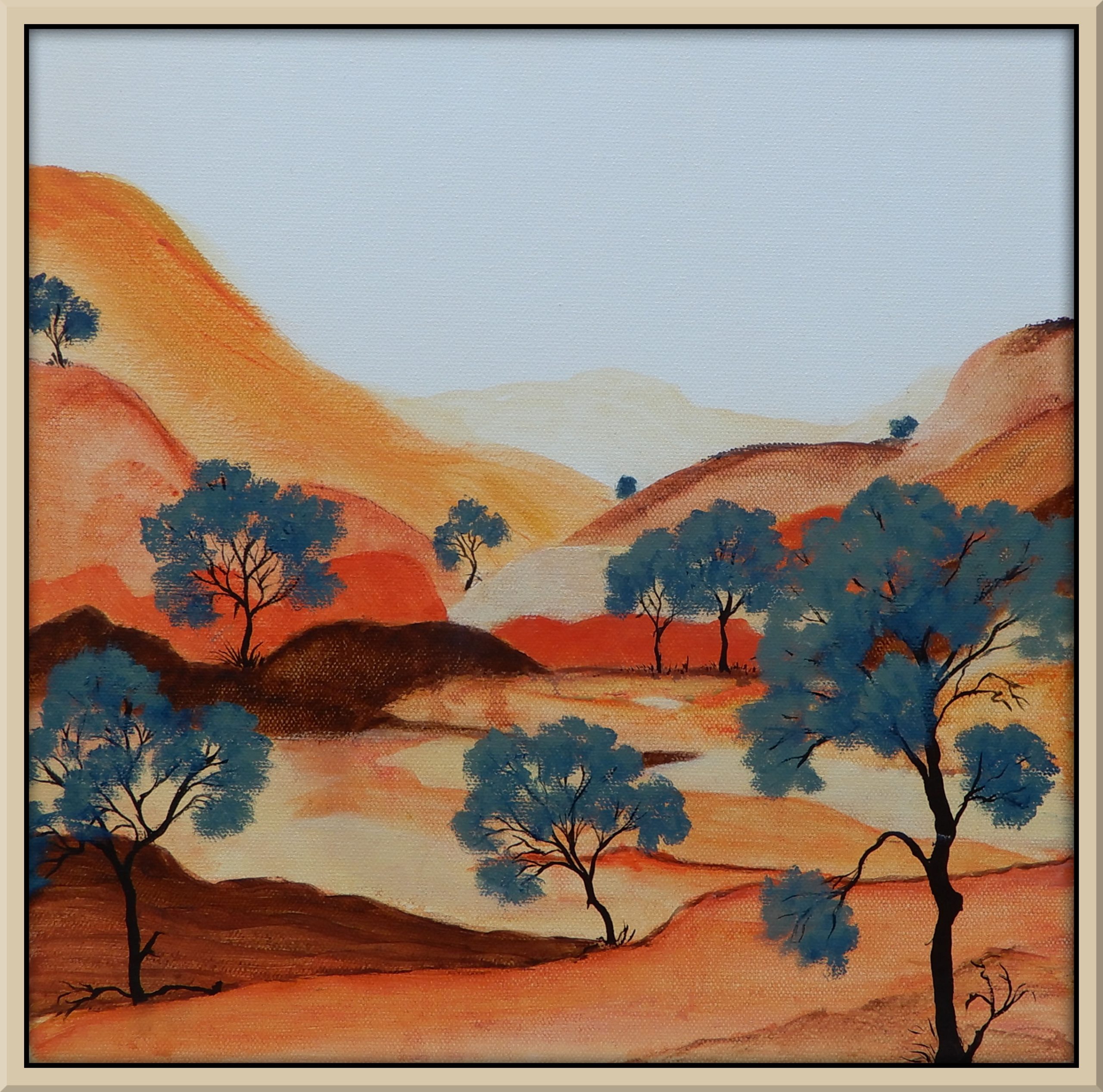 Summer light over the Red Centre, when the gums pop and the earth glows orange and gold. This painting comes ready to hang in a natural pine frame.