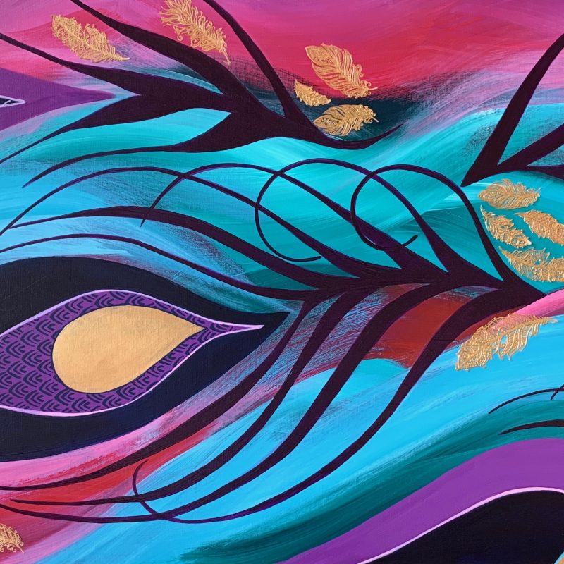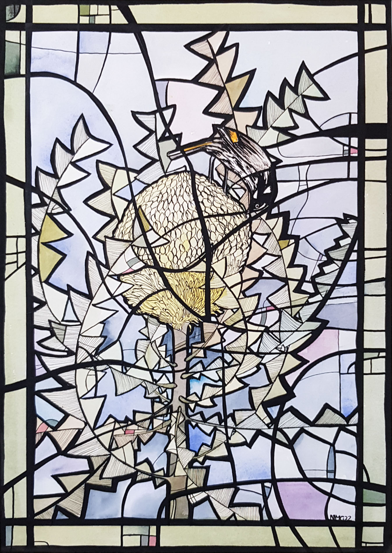 Honeyeater Feeding by Nicola Cowie – A honeyeater feasting on nectar from a banksia is depicted within and art deco style border. The distinctive branches of the banskia baxteri flow outwards and are filled with watercolour washes and delicate ink linework. The colours are kept intentionally light to contrast with the black lines and let the light of the paper come through.