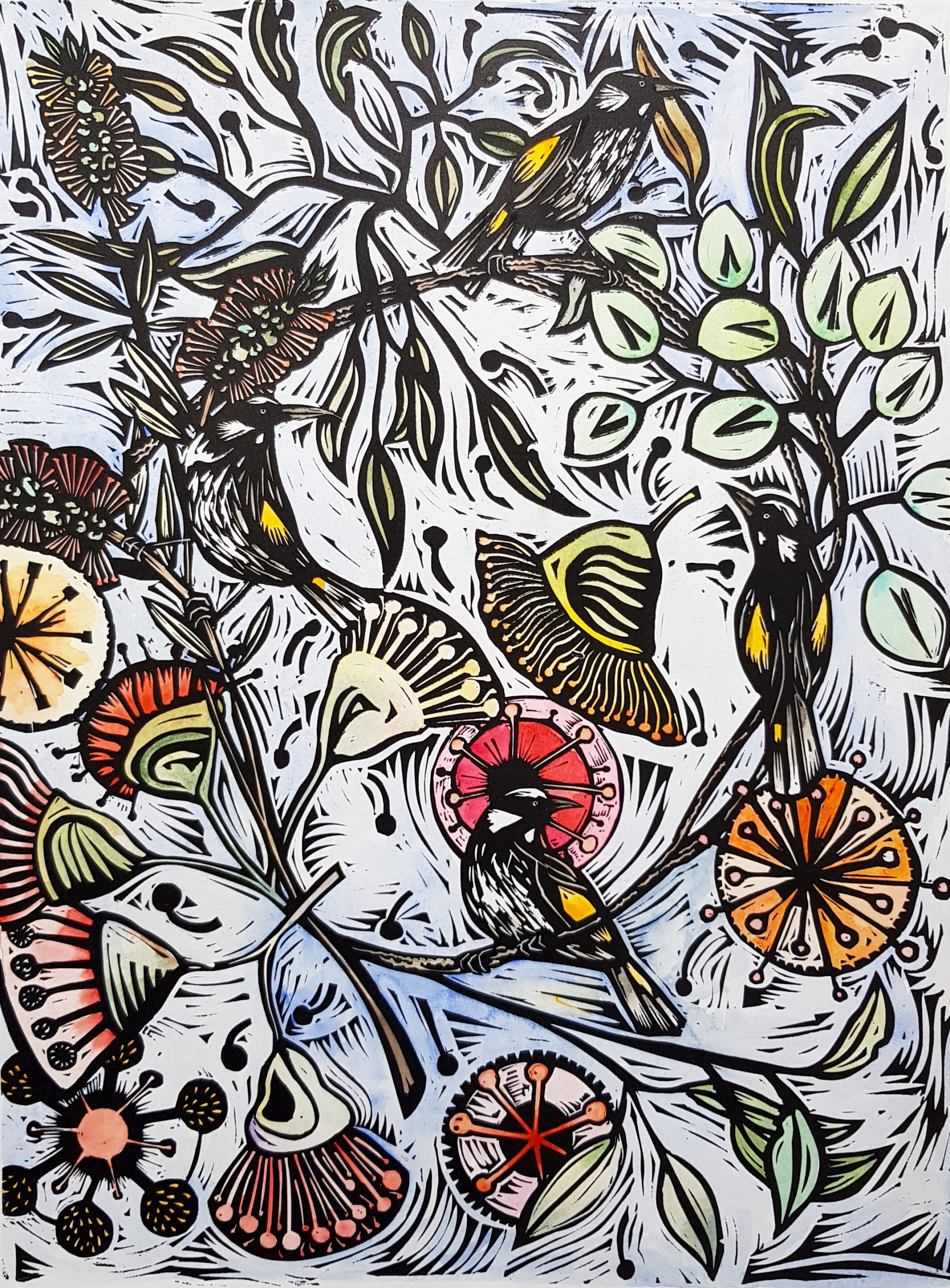 The linocut is filled with stylized flowering gums and filled with washes of watercolour which contrast with the printed areas.