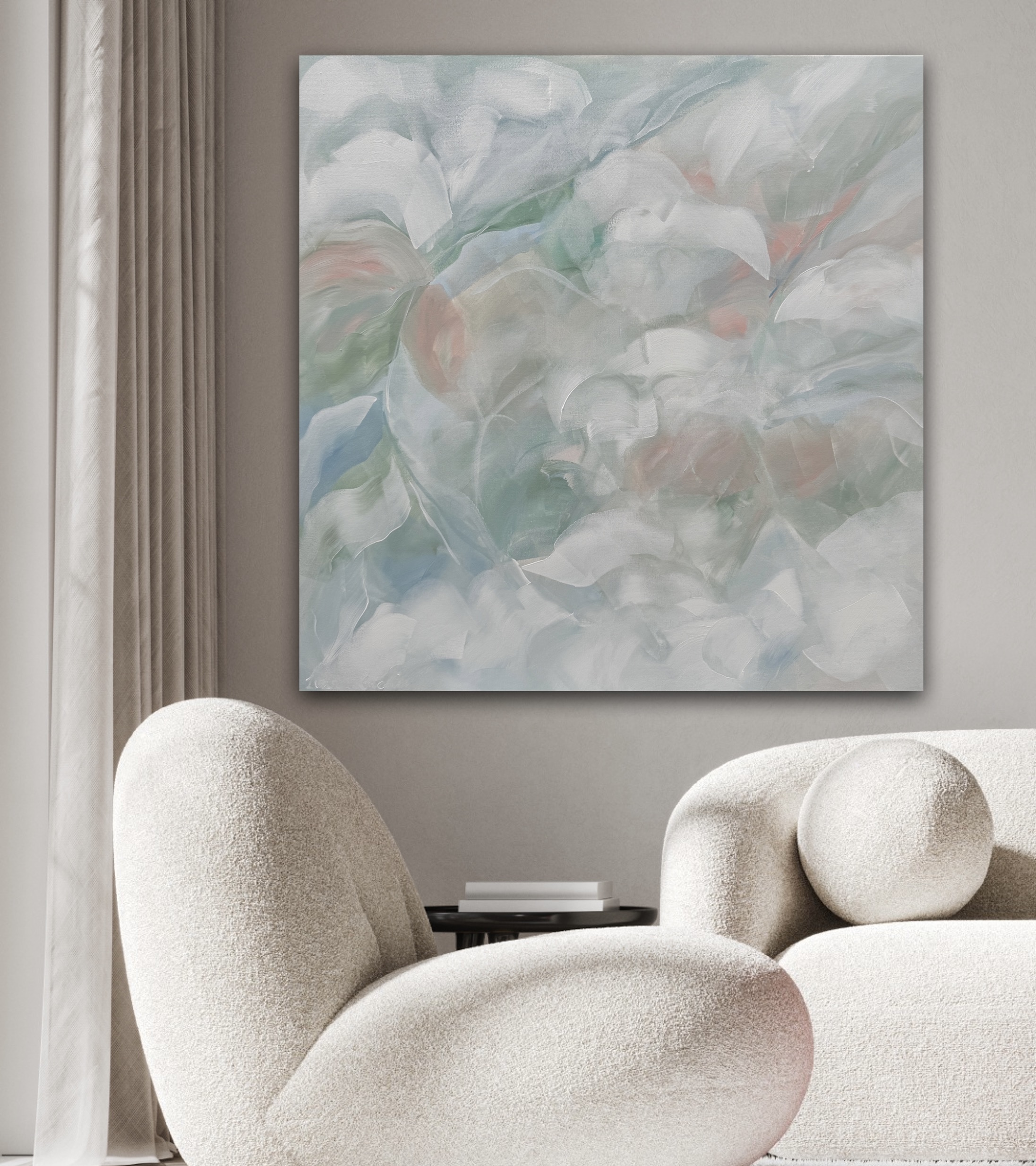 Soft layered brushstrokes in muted tones of green, blue and hints of warm blush creating a peaceful feel. The gentle blending of colours and airy texture give the piece an ethereal, dreamlike quality. Perfect for a serene, calming space.