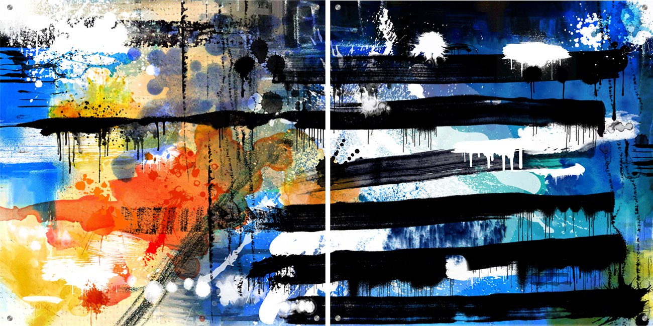 A very large diptych that will wow in any environment. Original abstract artwork, never to be reproduced, printed on UV protected acrylic glass, which allows it to be featured inside or out. Comes with Certificate of Authenticity and instructions to hang. Definitely will not disappoint in person.